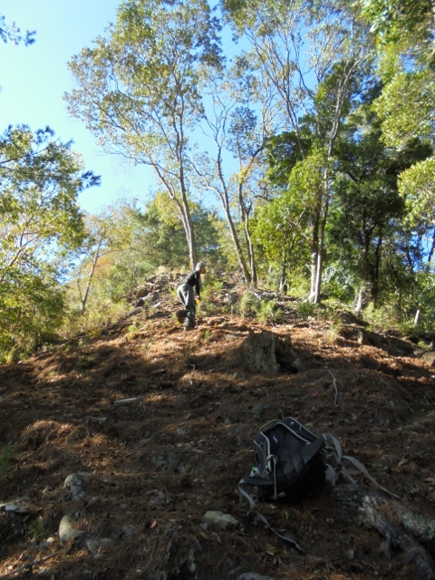 08:00 自匯流口開始沿著碎石陡坡上切,上次初勘的路條都還在,抵達一小平台,至此稜線稍趨緩,續行往上