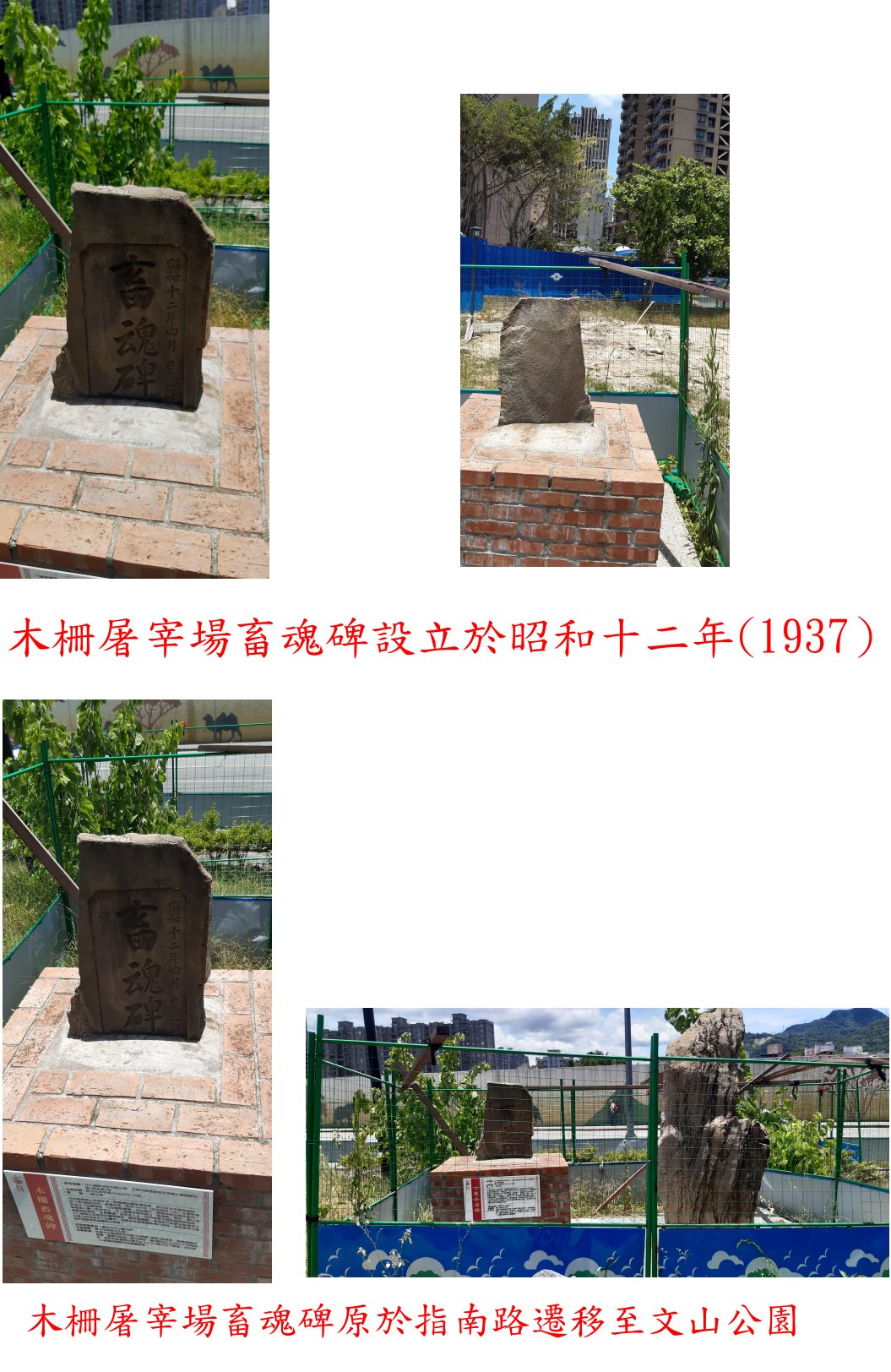 第4座為木柵屠宰場畜魂碑,設立於昭和十二年(1937)四月,原址在指南路一段十四巷內昔日的屠宰場(豬屠)旁,隨著的經濟發展與都市計畫等原因、遷移至文山公園重立(木新路一段與木柵路交叉路口),此碑靠近木新路一段,公園目前整修中有圍籬;旁另一座木柵忠魂碑,二座石碑並立,曾來過剛好來木柵國小找御大禮記念樹碑順道再訪。