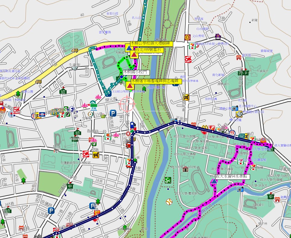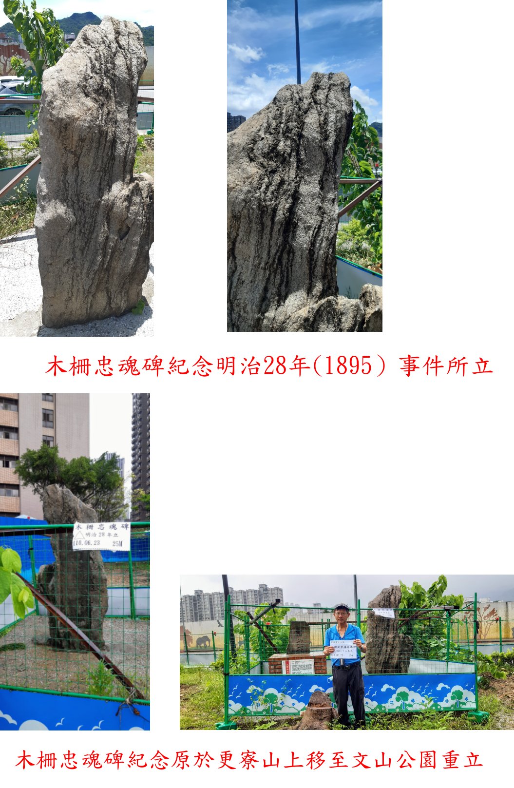 木柵忠魂碑原於景美溪畔更寮山上【指南路木新路口】,因該地要興建加油站遷移至文山公園重立(木新路一段與木柵路交叉路口),此碑係紀念明治28年(1895)被抗日人士殺害的警察事件所立,與深坑的忠魂碑為同一事件的紀念碑,碑文於戰後被塗抹無法辨識;旁另一座木柵屠宰場畜魂碑,二座石碑並立,曾來過剛好來木柵國小找御大禮記念樹碑順道再訪。