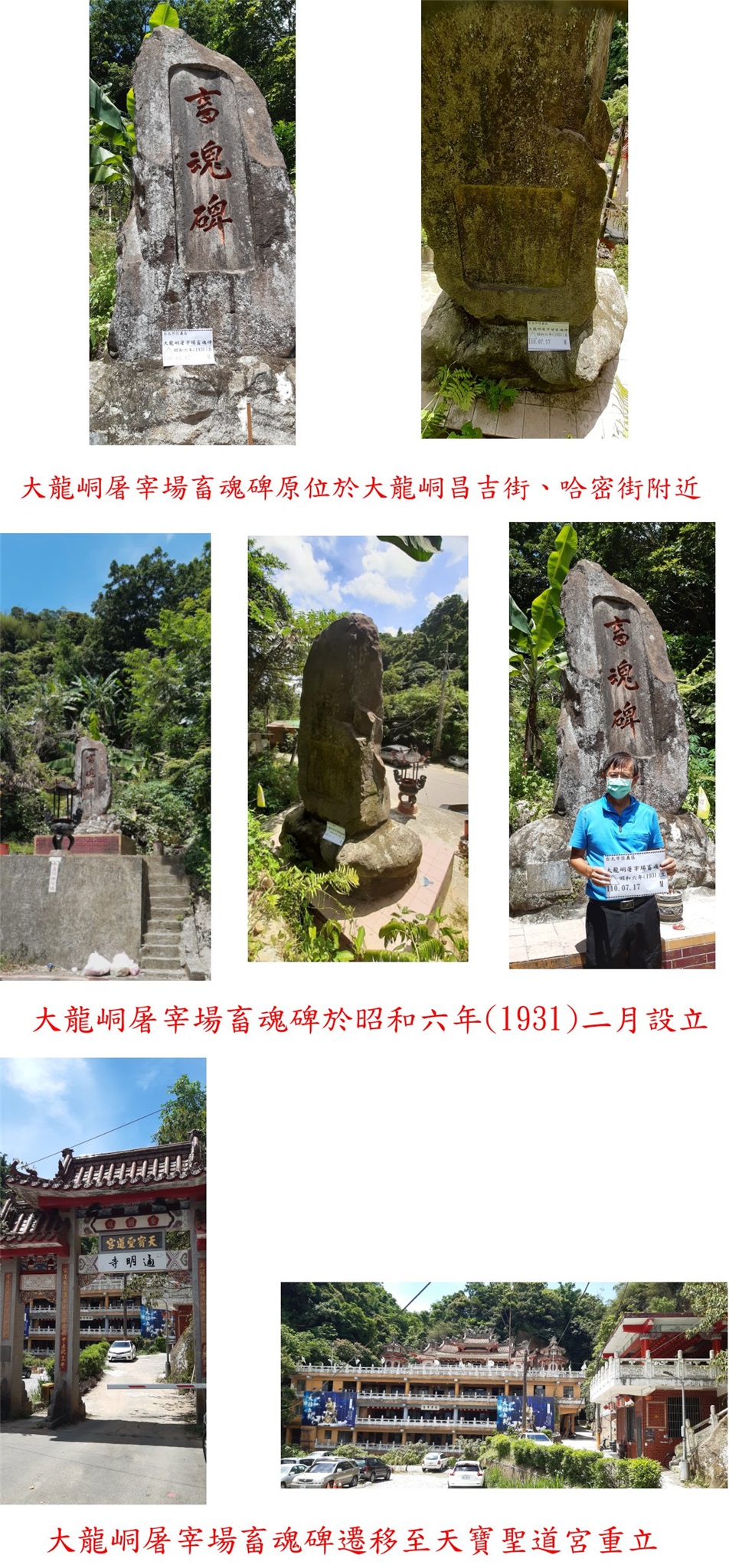 3、大龍峒屠宰場畜魂碑:位於台北市信義區,昭和六年(1931)二月設立,座標307572 2769271。