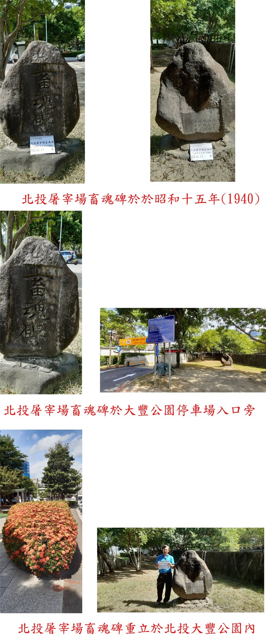 2、北投屠宰場畜魂碑:位於台北市北投區,昭和十五年(1940)設立;座標300008 2780607。