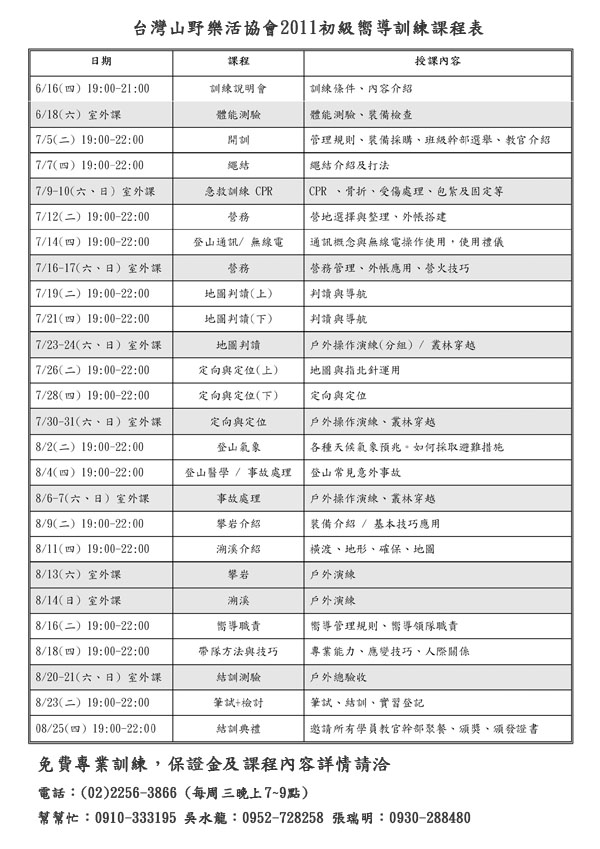 完全免費的初級嚮導訓練課程,訂於2011年6-8月舉行,對於登山,想要保護自己,進而保護他人者,這是最好的機會喔!去年沒搭上這班車的大大們,今年千萬不要再錯過囉!