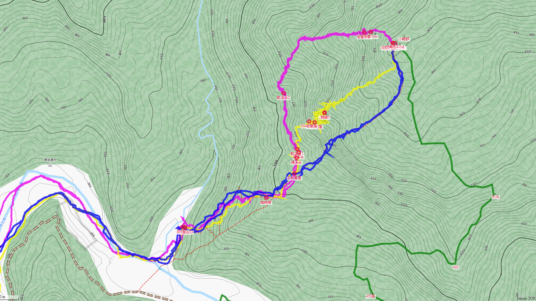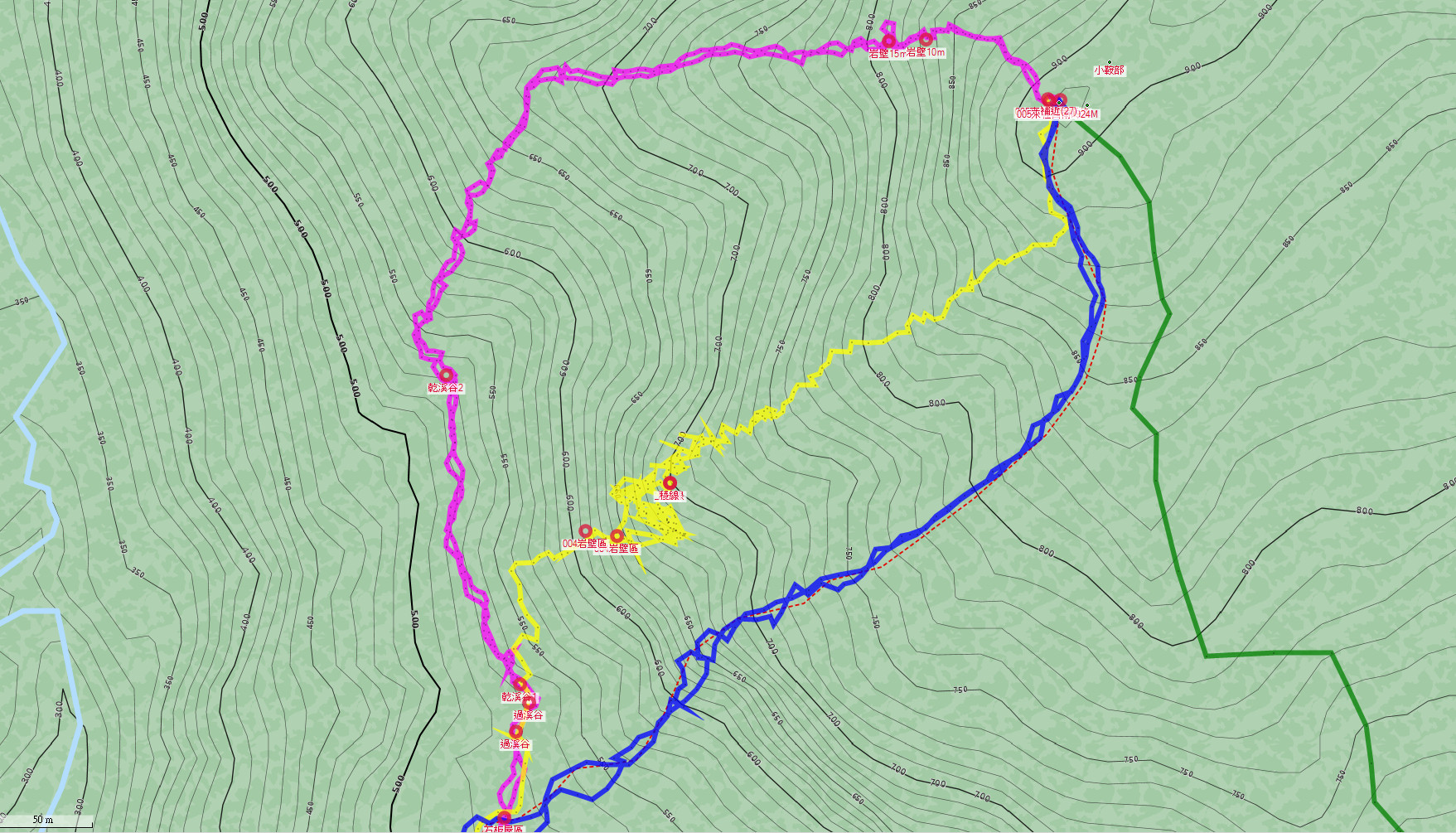 此山2007年可南稜上去,後來大崩塌後。2016年中間兩線(黃藍線)改由西南稜上去,但在6、7百米間有較垂直岩壁層危險高。