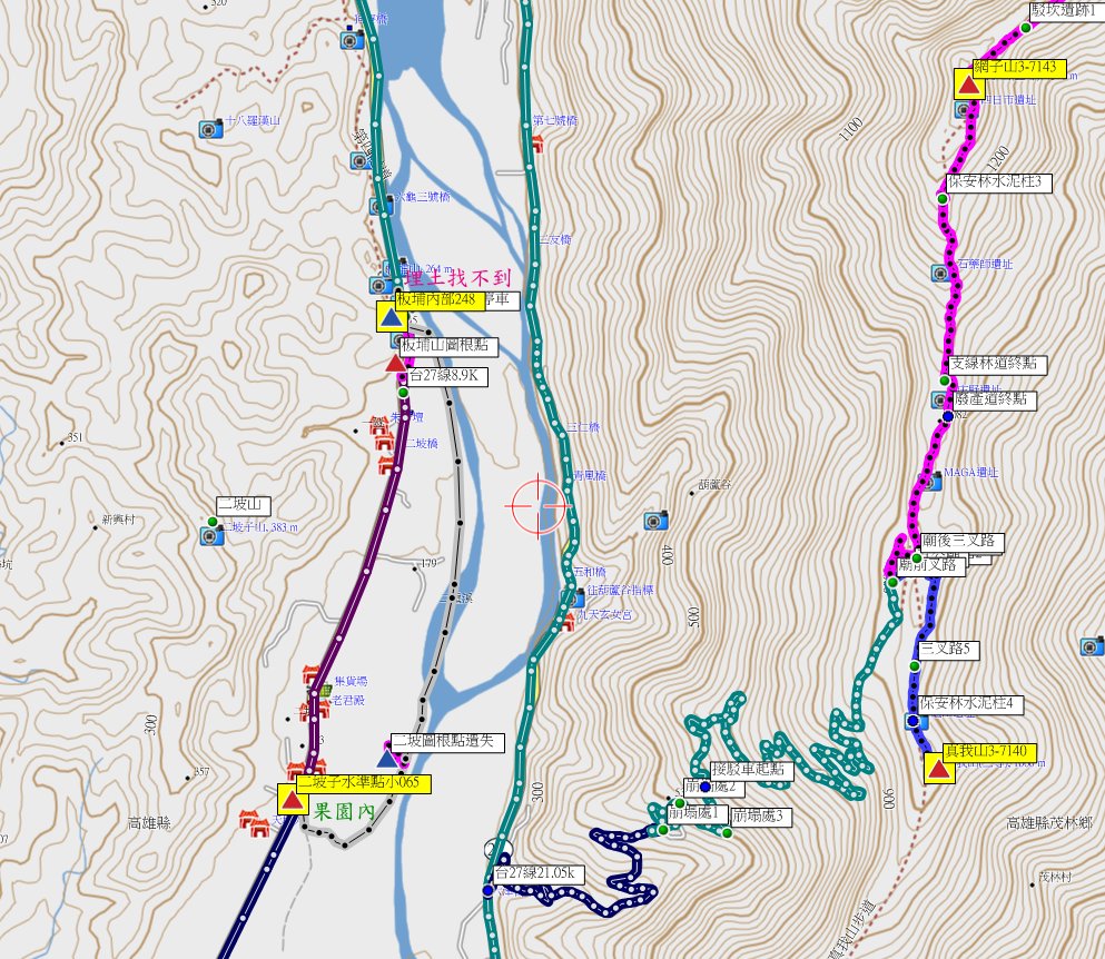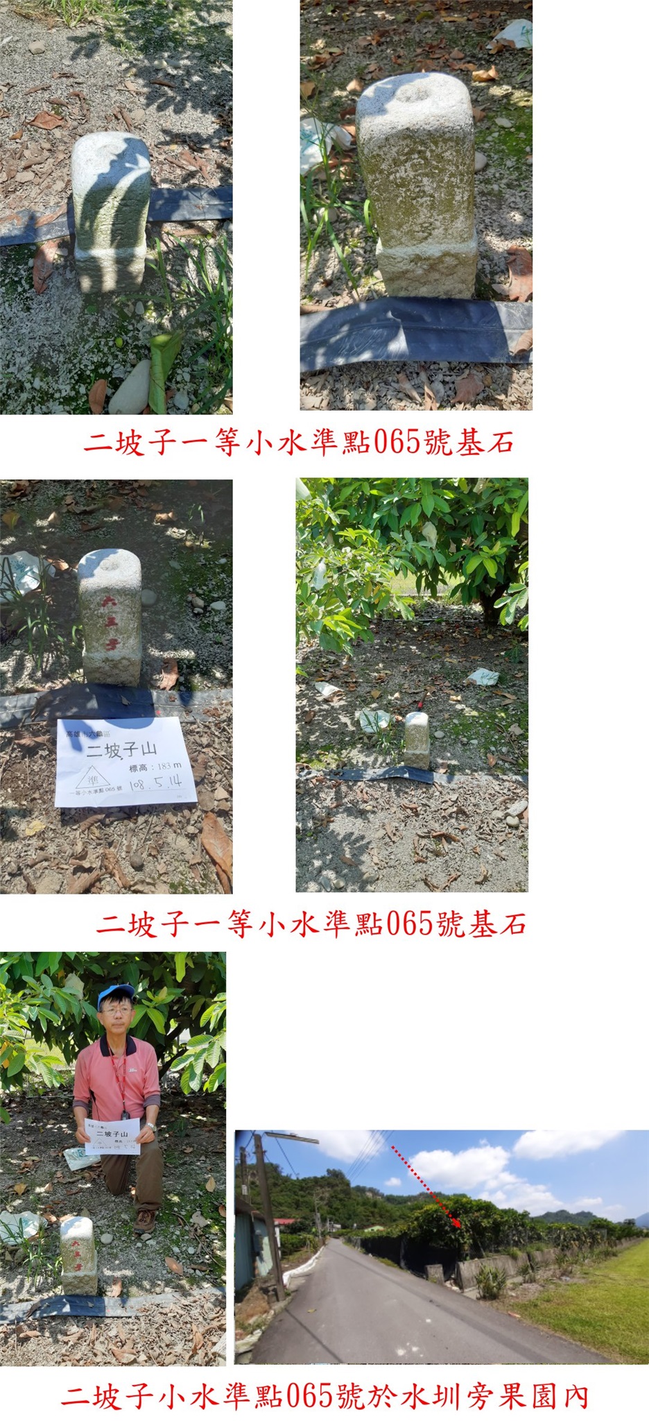 4、二坡子:位於高雄市六龜區,標高183公尺,一等小水準點065號基石;座標212121 2535397。