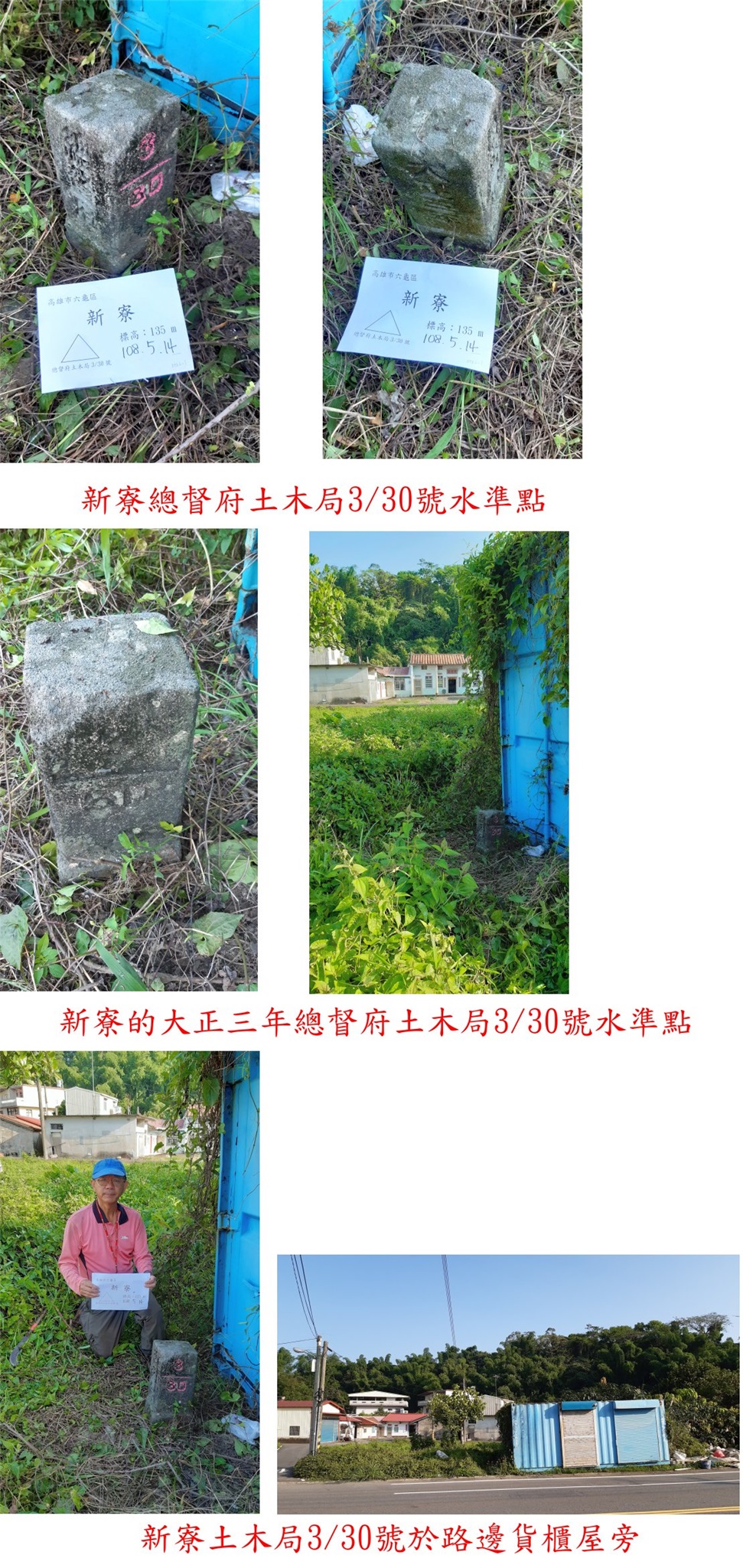 路左有個藍色的貨櫃屋,於貨櫃屋左側的草叢中找到新寮的大正三年總督府土木局3/30號水準點,離貨櫃屋約