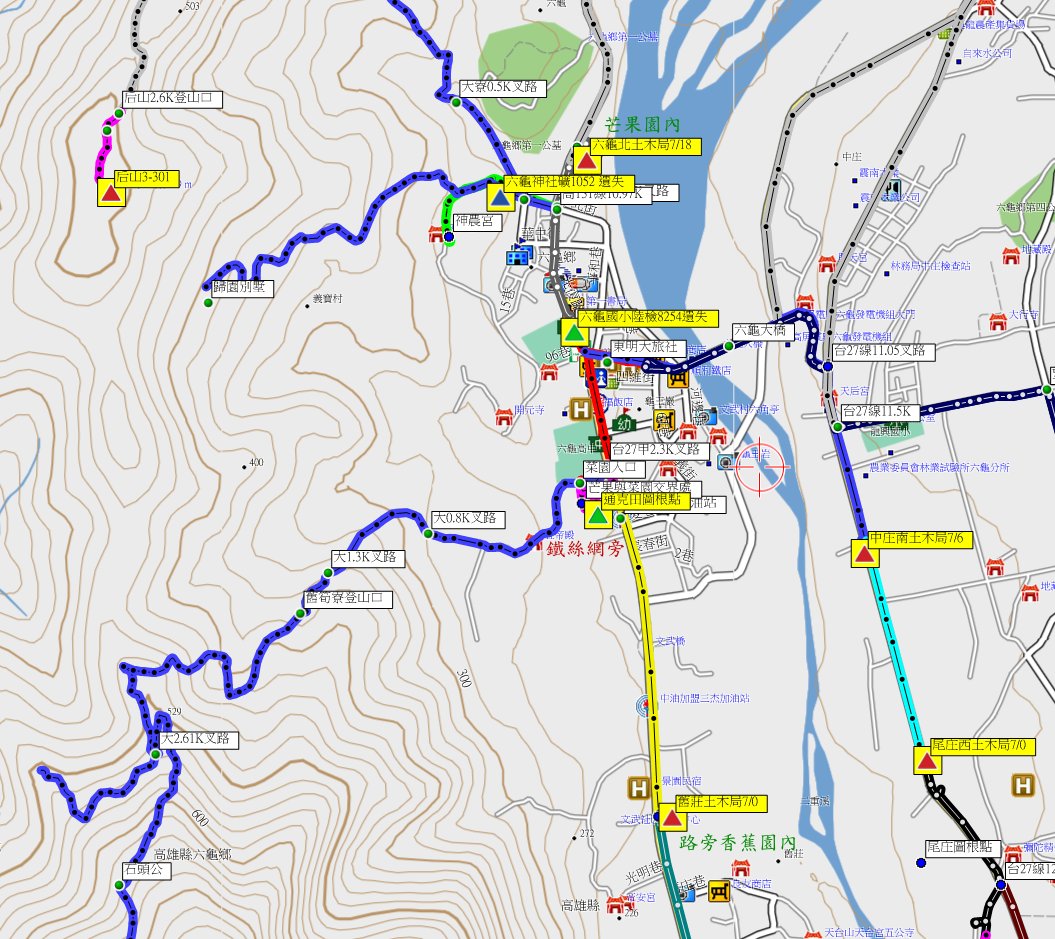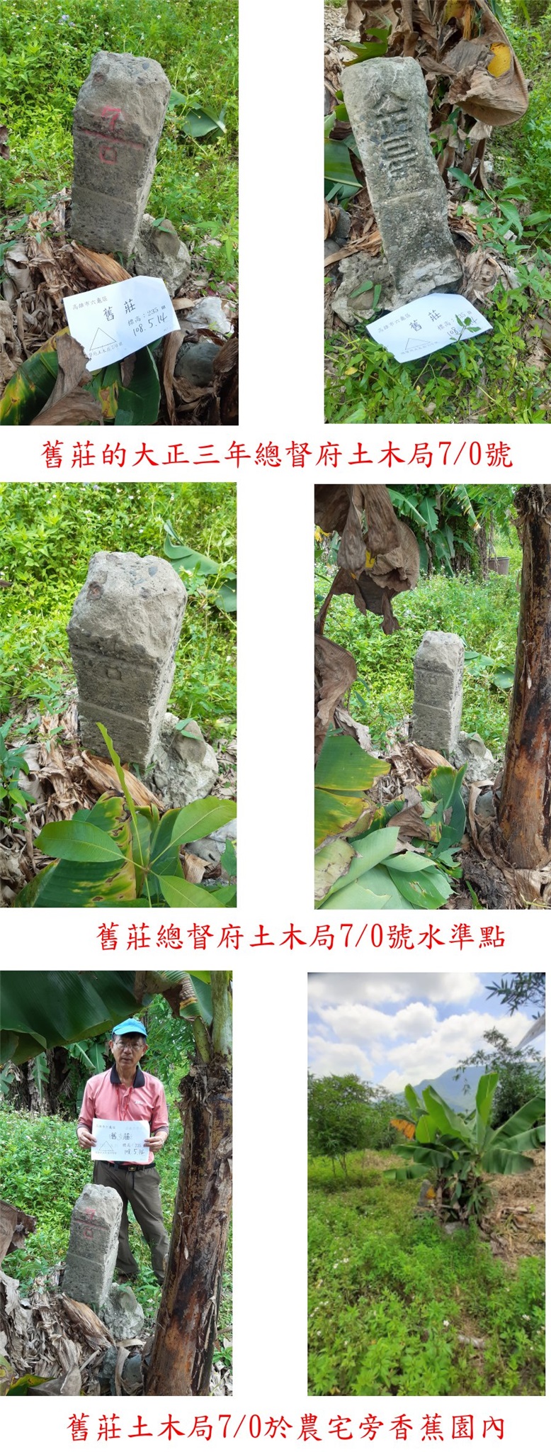 6、舊莊:位於高雄市六龜區,標高239公尺,總督府土木局7/0號水準點;座標212031 2542674。