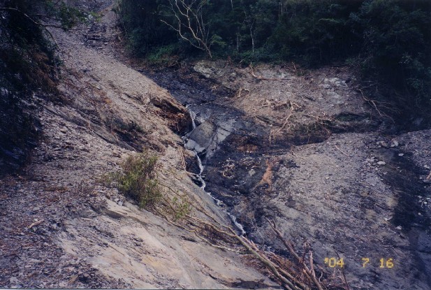 二、22.2K以後倒木眾多,只能通行機車或鐵馬,林道平緩易行,上下坡度不大。在29.6K遇新的土石流大崩壁,無法通行在此停車,輕裝出發,沿途路況很差,直到30.9K登山口,此處海拔約1200公尺。