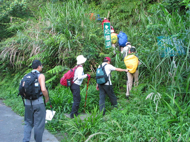 ◎張峰明嚮導說:沿林道直行一小段路,左側有路可下松蘿湖(有人走過)。