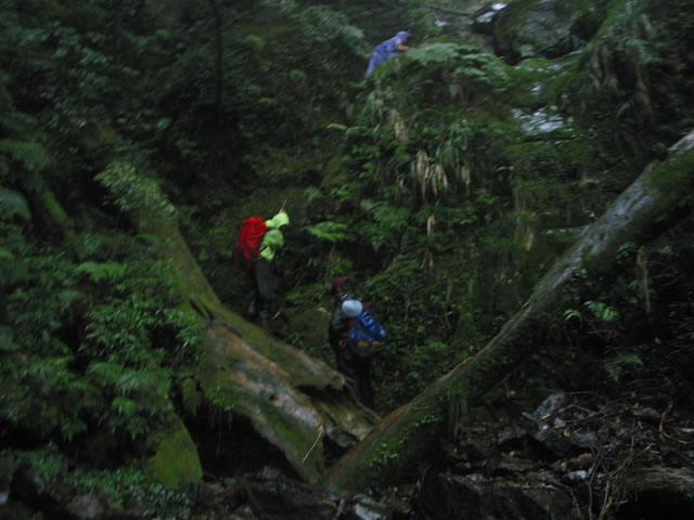 ◎沒想到雨勢又轉大,且夾帶隆隆雷聲,心情跌入谷底。心想:所有最壞的路況,今天全部都遇上了----雨天中的沼澤地、倒木濃密箭竹林、拉繩峭壁....。