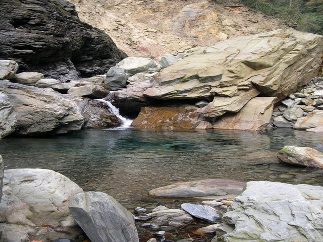 1月6日煮食小碗麵,腳底磨破也較不疼,只是兩手指凍傷紅腫,無力可使,由右坡旁樹林間出去,似有人跡、獸跡,但是重裝,很難通過,11:30又重回「成大山協」標識處,選定高點目標,回到往三岔路口的方向,努力尋找蛛絲馬跡以重建現場,看看是否能順利尋找出口回家,如不可得,亦抱定由來時路往南一段再走一趟6天回程,經過長滿與人齊高的蘆葦陡坡,直下有水源,但非得繞下或繞上始能安全通過,登上樹林子以為上了高頂,又闖入一樹林,好不容易下切到山間谷地,那是多重谷地交織著形成幾潭清澈的潔淨水源,先喝個夠,再用水袋裝滿約2公升,是時,身處猶如侏儸紀原始奇幻林之美景,鎂光燈閃爍,摘取美景入鏡,17:30攀登到與山友分手之山林地,就林間空曠地紮營。