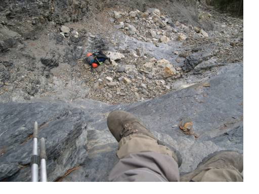 1月5日04:00想趁黑趕路,找出與大夥兒分手之來時路,從坍方碎石坡難下,但較光亮,難下,小心下,先拋營帳、睡墊,背包利用營繩緩拋,人再緩下,步步小心,又見坍方阻路,先汲水,再回林邊,08:09有直升機聲音,對之吹哨子、招手,均無回應。煮麵補充體力,節省糧食,以備長期所需,腳底心磨皮肉綻,不良於行,13:00升營火待援,14:00、14:30、16:30、16:45陸續有直升機飛過,引擎聲來,希望來了,聲音去了,亦若有所失,選擇背風石壁休息。