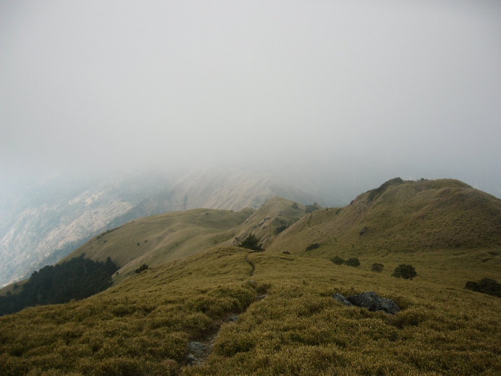 11:24 由下行稜線路,風勢依然是強徑難行,同行三位壯丁,都是第一次爬高山,就遭遇此種挑戰,雖心裏有些過意不去,不過未嘗不是一種寶貴的經驗。在遇叉路口3,取右下稜線路,直行路不知通往何處?
