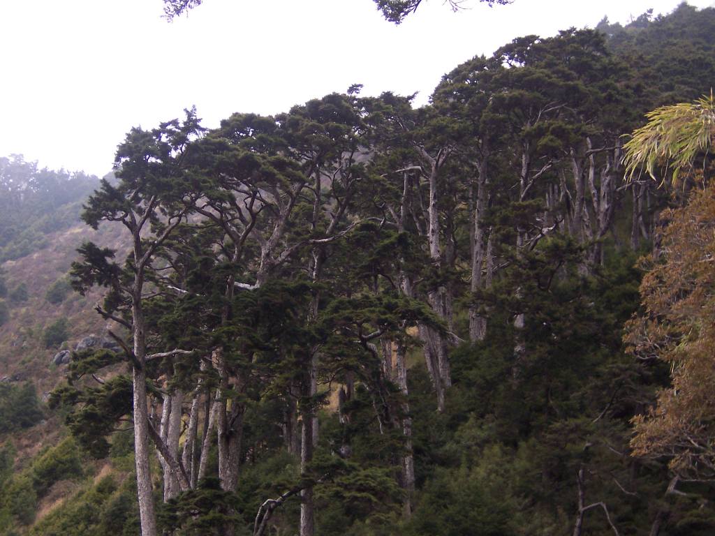 07:11 上坡路高大的箭竹林穿梭了許久,終於出箭竹林改走腰繞路,頓時視野豁然開朗,再循低矮箭竹而行,不久即抵天池的叉路口,一路上仍可見到一些到殘雪。取左往奇萊南峰,往右則是到南華山。