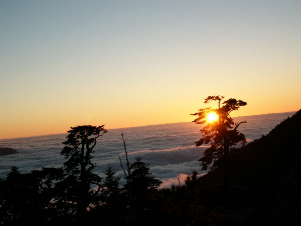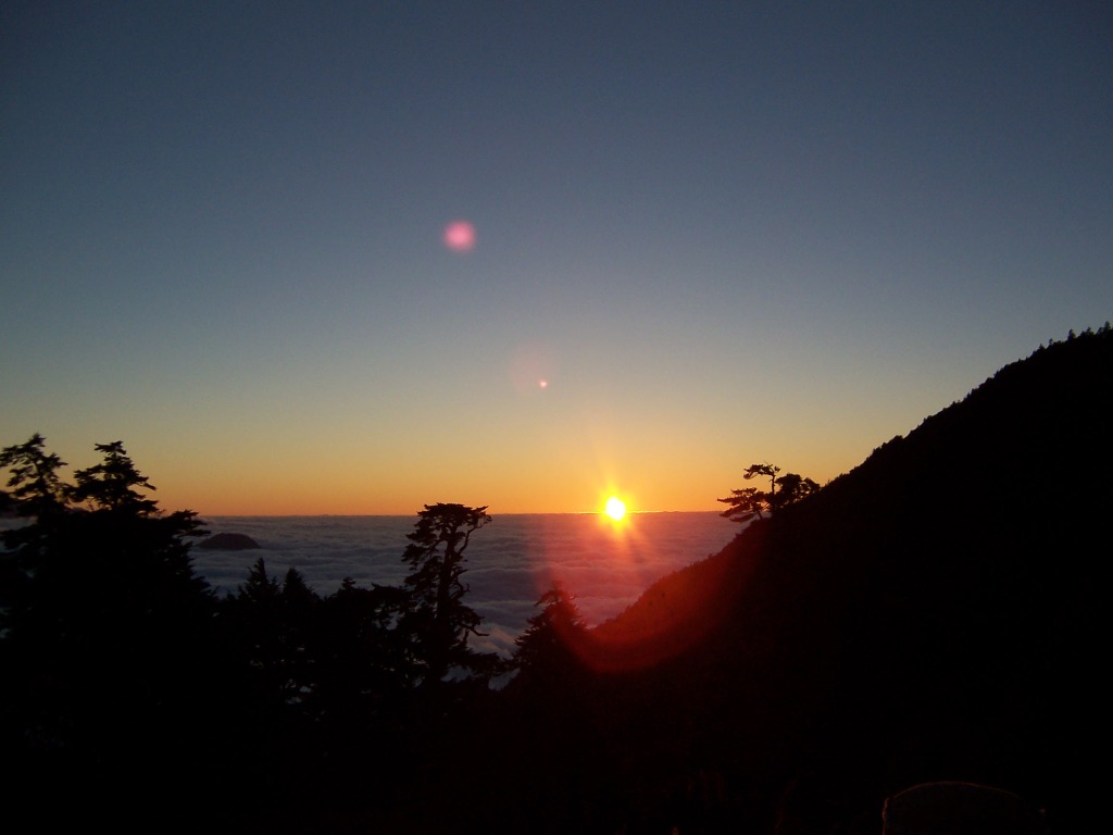 17:02 回天池山莊。不一會兒,有其他山友吆喝來看日落和雲海,其綺麗之狀,無可言諭。今晚正巧是農曆十五日,這時的月亮,顯得特別的皎潔明亮,加上夜空滿天的星星,在此賞景,乃是人生的一大享受。