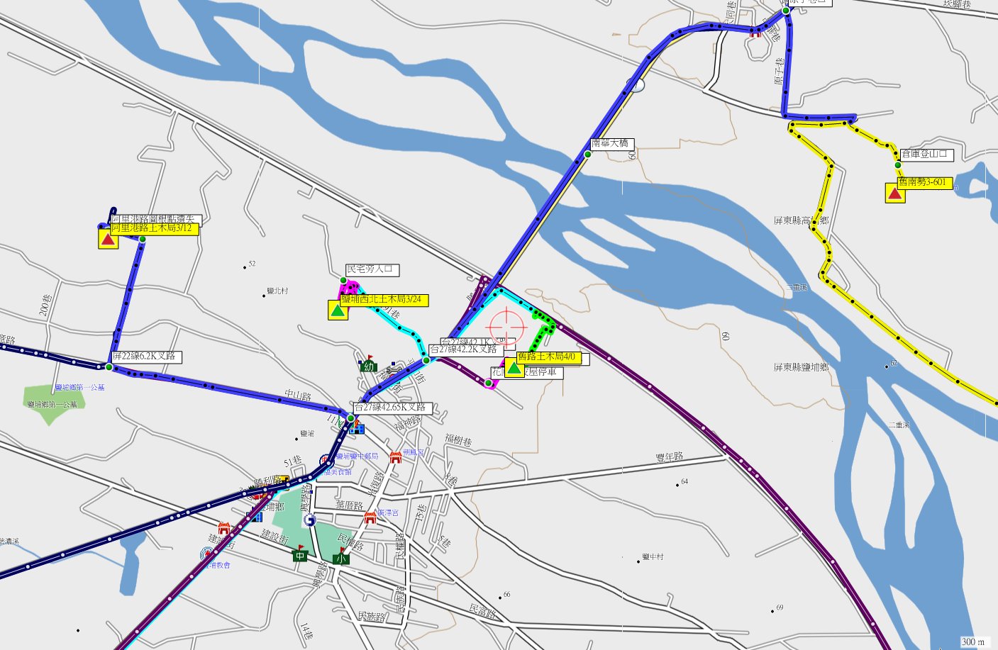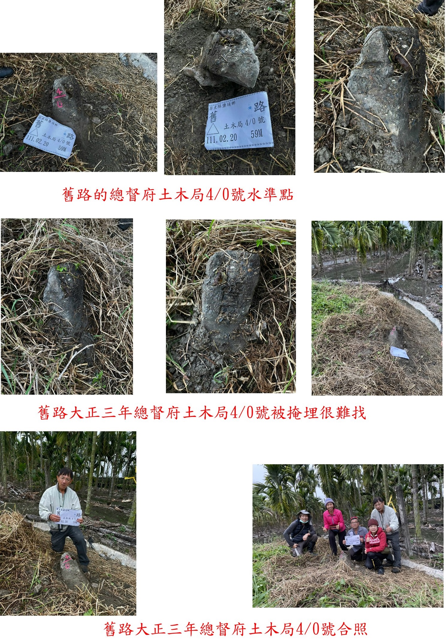 4、舊路:位於屏東縣鹽埔鄉,標高59公尺,土地調查局圖根點遺失,另有大正三年總督府土木局4/0號水準點;座標206473 2517976。