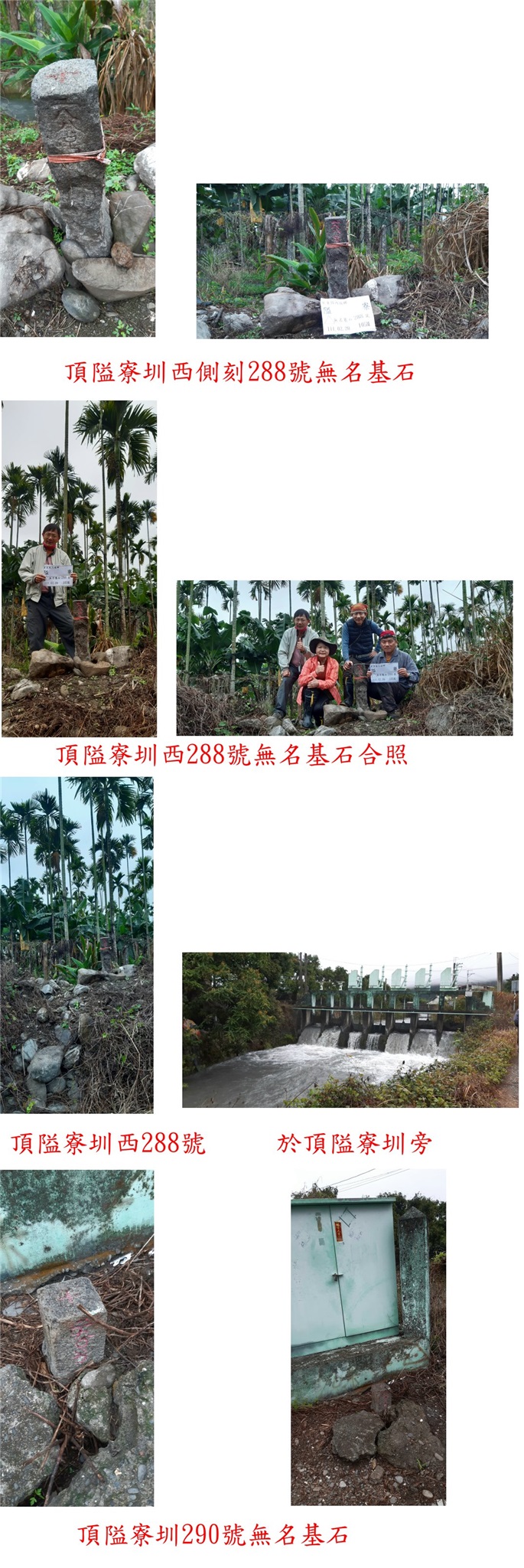 3、頂隘寮圳西:位於屏東縣內埔鄉,標高87公尺,側刻288號無名基石;座標:2116322511833。