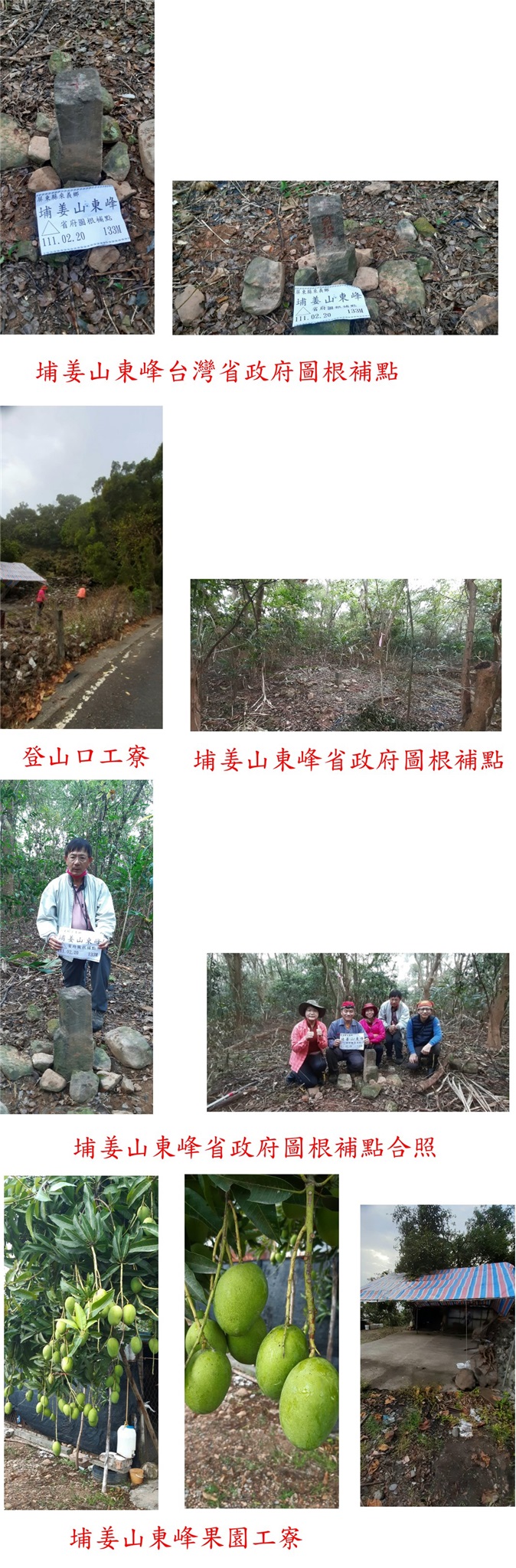 取右進入芒果園由工寮旁上切走60餘公尺,於平台地見到埔姜山東峰的省政府圖根補點;基石因開墾被棄置最近被台東阿倫找出,熱心的山友已將基石重埋明顯好找,往返只要11分鐘就輕鬆入袋。