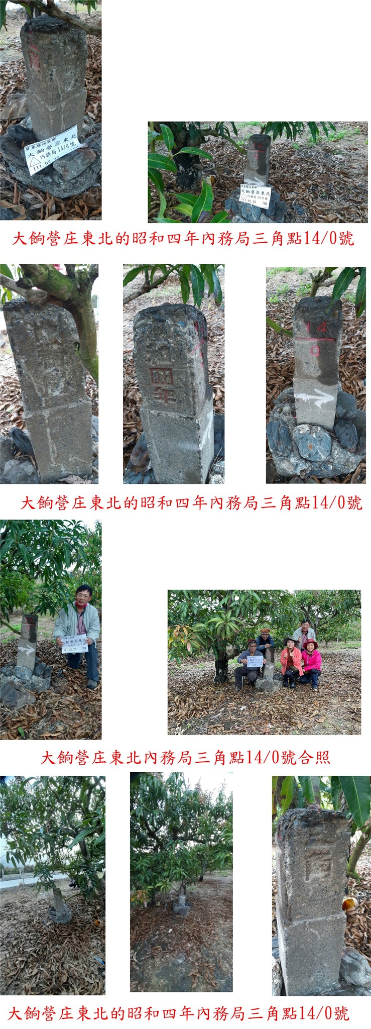 1、大餉營庄東北:位在屏東縣枋寮鄉,標高60公尺,昭和四年內務局三角點14/0號基石;座209801 2481847。