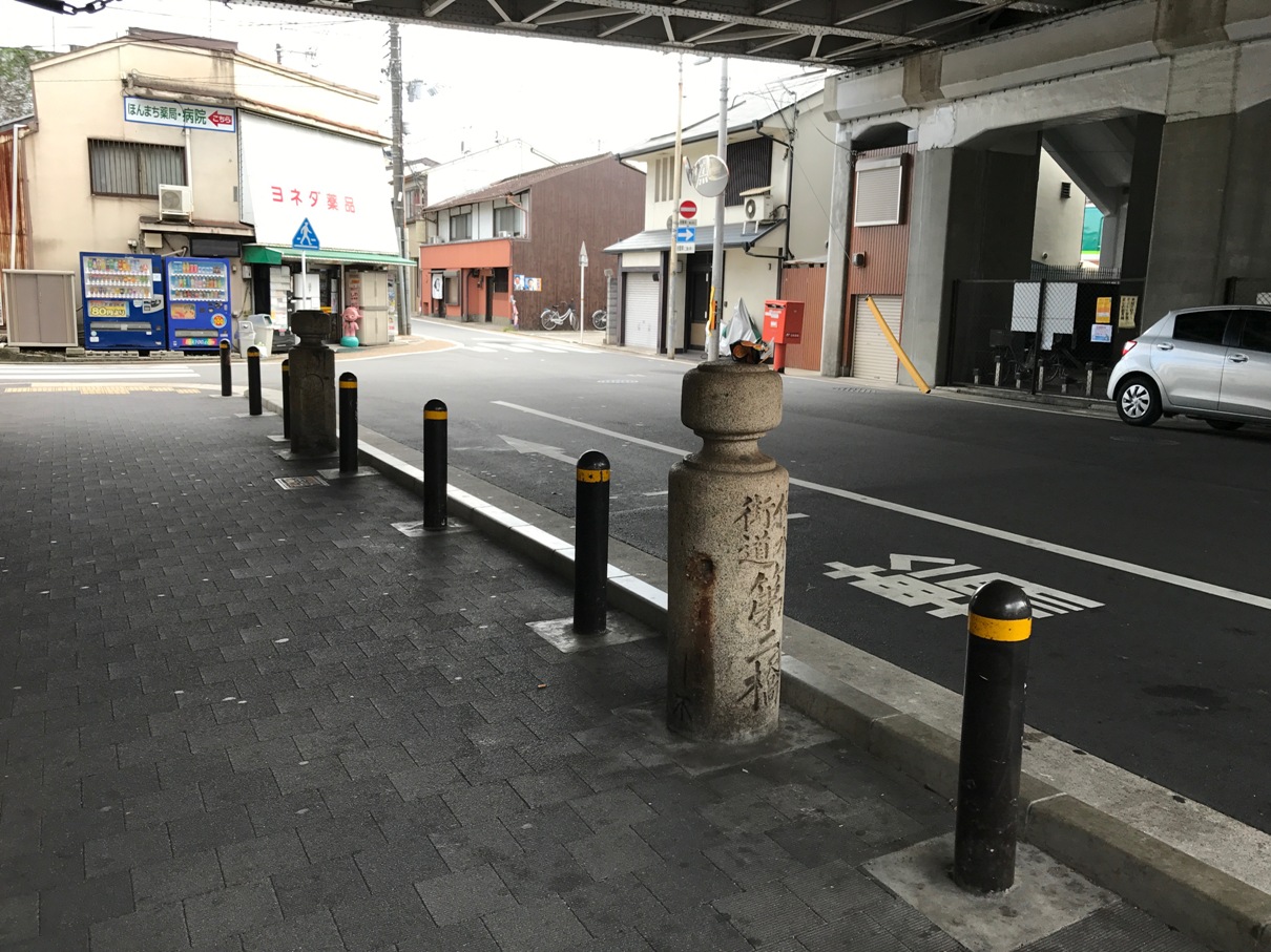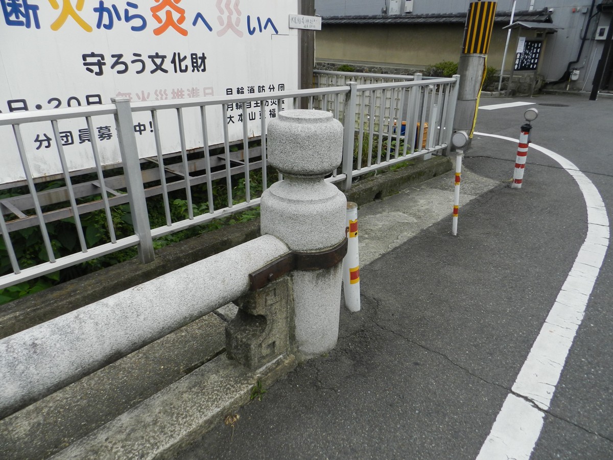 由JR奈良線及京阪本線東福寺駅的東口﹝全家便利商店南側的岔路口﹞,沿向南的伏水街道走約60公尺到高架道路143號府道﹝九條通﹞的涵洞下方,在道路東邊的人行道兩側,有四根伏水街道第二橋的橋頭石柱。