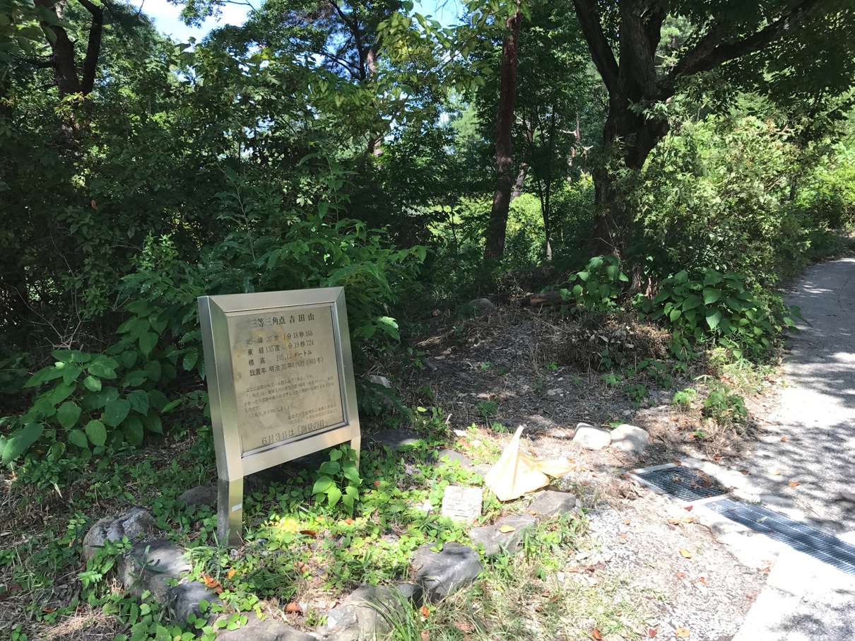 此點幾年前曾經來過,當時由北側的入口沿步道上山﹝101號府道,即今出川通﹞,此次為了找測點標石,改由南側的竹中稻荷神社上山。由平安神宮東北角的岡崎通及187號府道﹝丸太町通﹞的岔路口,沿向北的岡崎通走約140公尺遇丁字路,右轉向東走約90公尺遇右岔小路不取,左轉順主線向北走約300公尺遇左岔路,左轉向西偏北走約40公尺遇右岔路,右轉向東北走約220公尺遇丁字路,左轉向西北走約110公尺遇右岔路,右轉向東北走約80公尺遇左側的吉田山步道時找地方停車﹝在竹中稻荷神社參道前﹞。左轉沿步道經過兒童遊憩區,走約100公尺到步道西側﹝在吉田山公園兒童遊憩區的西北方﹞,即可見到新立的三等三角點。