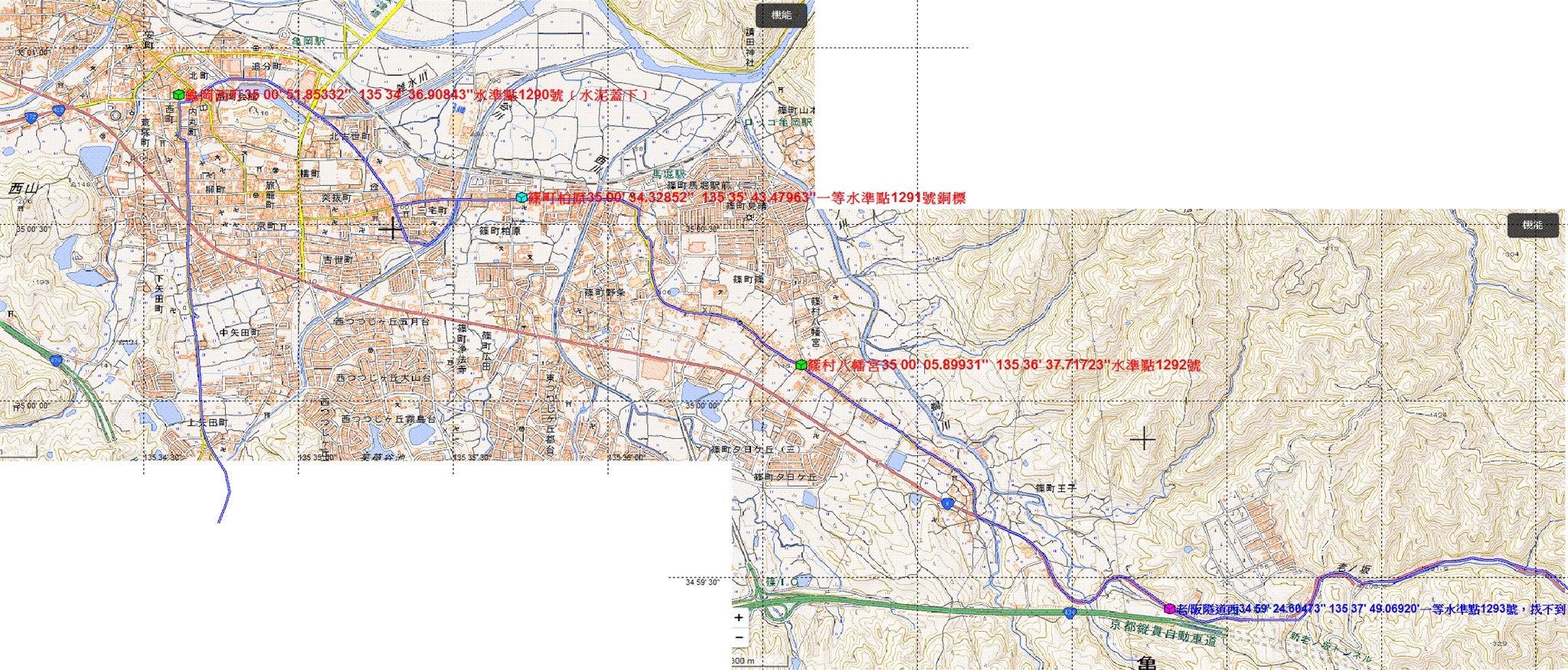 ●老ノ阪隧道西34 59' 24.60473'' 135 37' 49.06920'一等水準點1293號,找不到