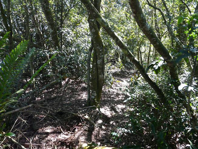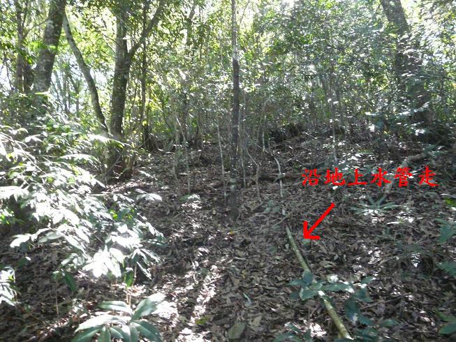 順茶園和樹林的交界處小徑直上(有綁白色布條)