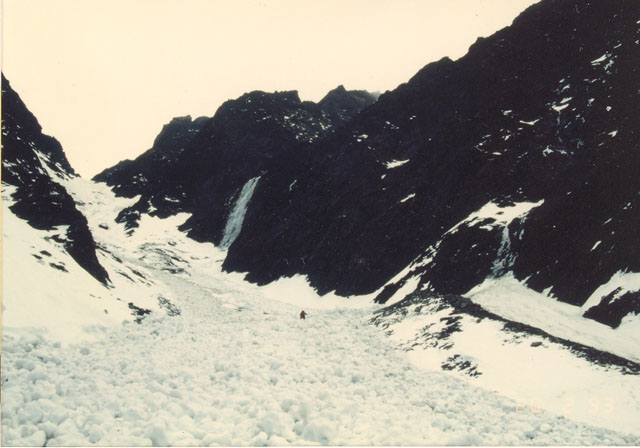 以前在雪季有到過中央尖山兩次, 都在劍溝標高2950m處的雪地紮營, 都有登積雪的劍溝. 那兩次經過劍溝時, 沒有特別落冰.落雪.落石的印象, 但在另一條雪溝(當時是好天氣的下午時候), 有遇到咻咻而過的落石.落雪.