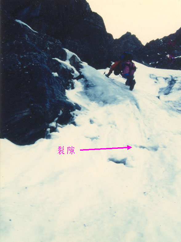 就如wanderer山友提到, 雪溝中也有裂隙(與冰河裂隙有點像), 就是在地心引力作用下, 下方較厚重的雪移動較上方的雪快, 造成斷裂, 出現裂隙, 如附圖. 當時裂隙約10公分寬, 所以人不會掉進去, 不過久了裂隙可能會變大.
