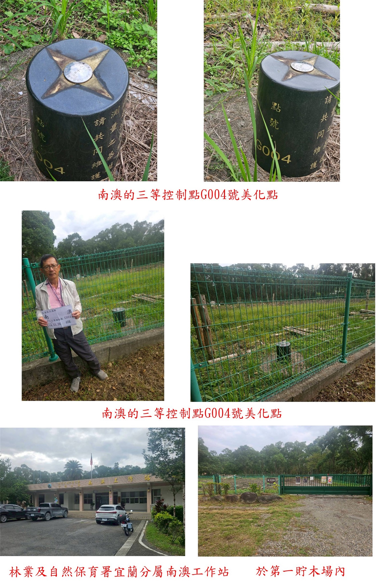 南澳生態教育館(南澳中正路55號),於林業及自然保育署宜蘭分屬南澳工作站前停車,於工作站前圍籬內的邊緣、見到南澳的三等控制點G004號美化點;於第一貯木場內、有圍籬並告示禁止進入,隔著圍籬拍照。