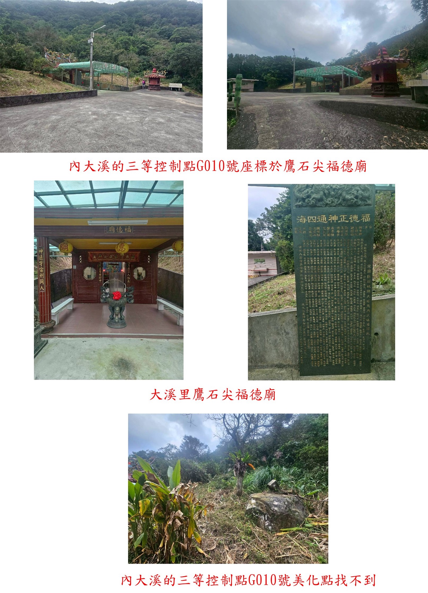 內大溪的三等控制點G010號美化點於路左福德廟附近,但卻4處找不到;G010號美化點由歷年的街景圖都看不到,此點不知為資料錯誤或是已遺失?