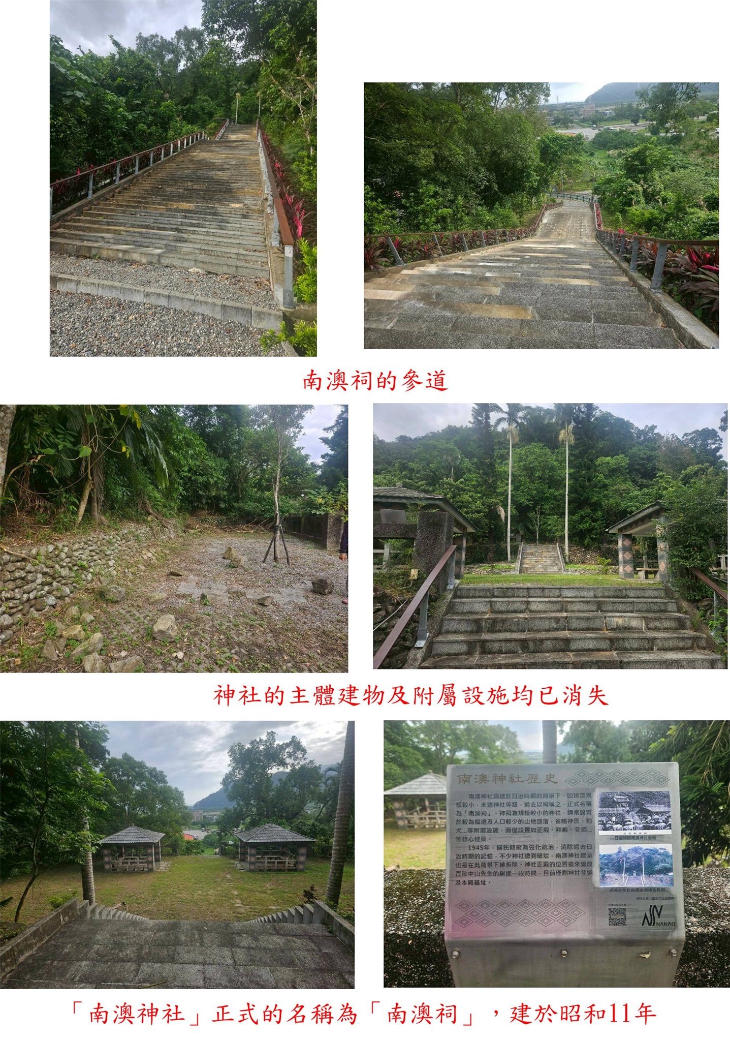 「南澳神社」正式的名稱為「南澳祠」,建於昭和11年,祭神為天照大神、開拓三神、北白川宮能久親王,神社現址為南澳鄉保護區公園;此神祠屬規模較小的神社,通常設置於較偏遠及人口較少的山地部落,神社常見的附屬設施,如神馬、狛犬、石燈籠等都省略,而僅設置核心的建築,例如正殿、拜殿、參道等。寬闊的石階路為神社的舊參道,爬到上方的平台,是昔日的拜殿;再上一層,最高處是正殿的所在,神社的主體建物及附屬設施均已消失,不過整體來看,神社的格局依然清晰可辨,唯一遺址只剩正殿平台四周的砌石駁坎。南澳神社正殿前的舊照片中,還可看到後來放置的孫中山先生銅像;建華冰店的老闆娘為當地人,告知小時候還看到些遺跡,但此神社很可憐,後來連銅像也被偷光了。參觀南澳祠後到建華冰店吃碗傳道冰。