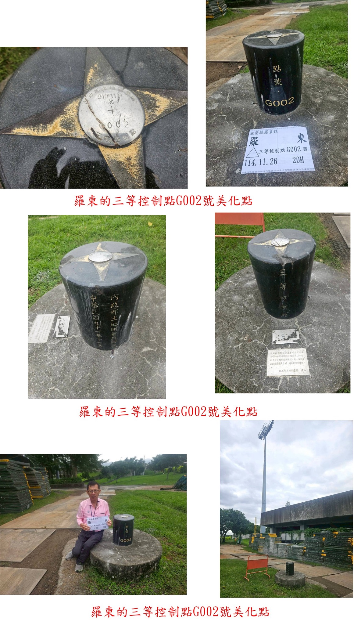 1、羅東:位於宜蘭縣羅東鎮,標高27公尺,三等控制點G002號美化點;座標324933 2731162。