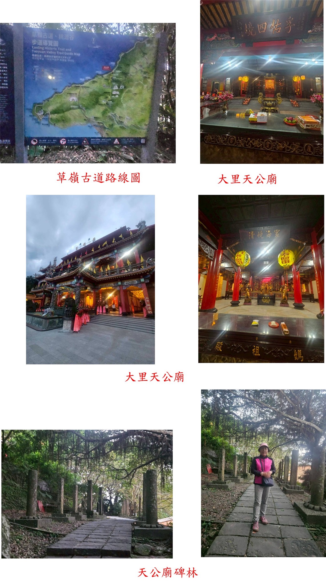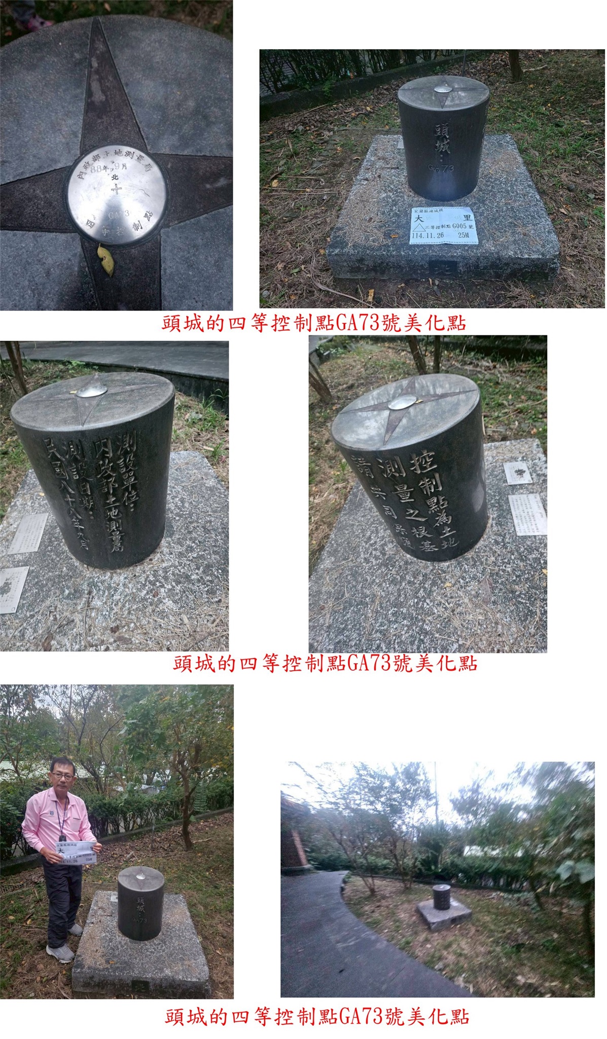 草嶺慶雲宮(大里天公廟)香客停車場停車,往回走60公尺走階梯路上到大里天公廟;廟旁接草嶺古道走50餘公尺經天公廟碑林,續走20公尺至大樹分叉路,取下方的步道走20餘公尺,於長方形休憩亭前、見到頭城的四等控制點GA73號美化點;此點資料為大里的三等控制點G005號,實際上名稱為頭城、點號亦不同,且為少見的四等控制點;內政部土地測量局設立於民國88年9月。