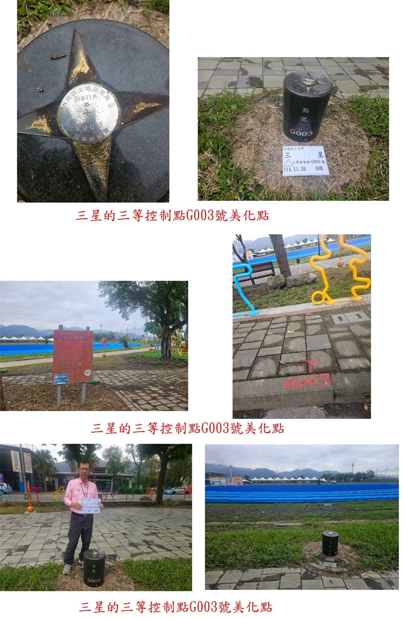 2、三星:位於宜蘭縣三星鄉,標高95公尺,三等控制點G003號美化點;座標315369 2729466。