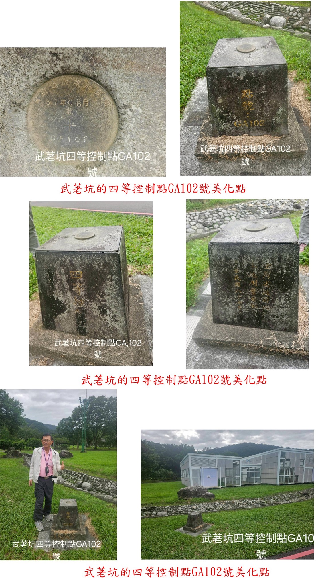 買票進入武荖坑風景區,園區道路走約3百公尺至農村好物館,於路右見到武荖坑的四等控制點GA102號美化點;此點資料為三等控制點G006號,實際上點號卻是GA102且為少見的四等控制點,台灣省政府地政處土地測量局設立於87年6月;武荖坑風景區已來過多次,此回只是摸點而來拋照後即離去