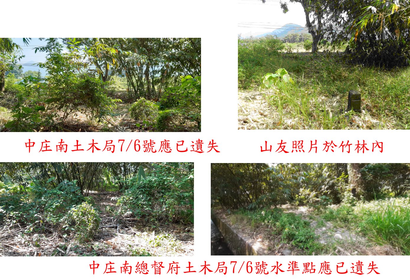 4、中庄南:位於高雄市六龜區,標高255公尺,總督府土木局7/6號水準點應已遺失;座標212682 2543460。