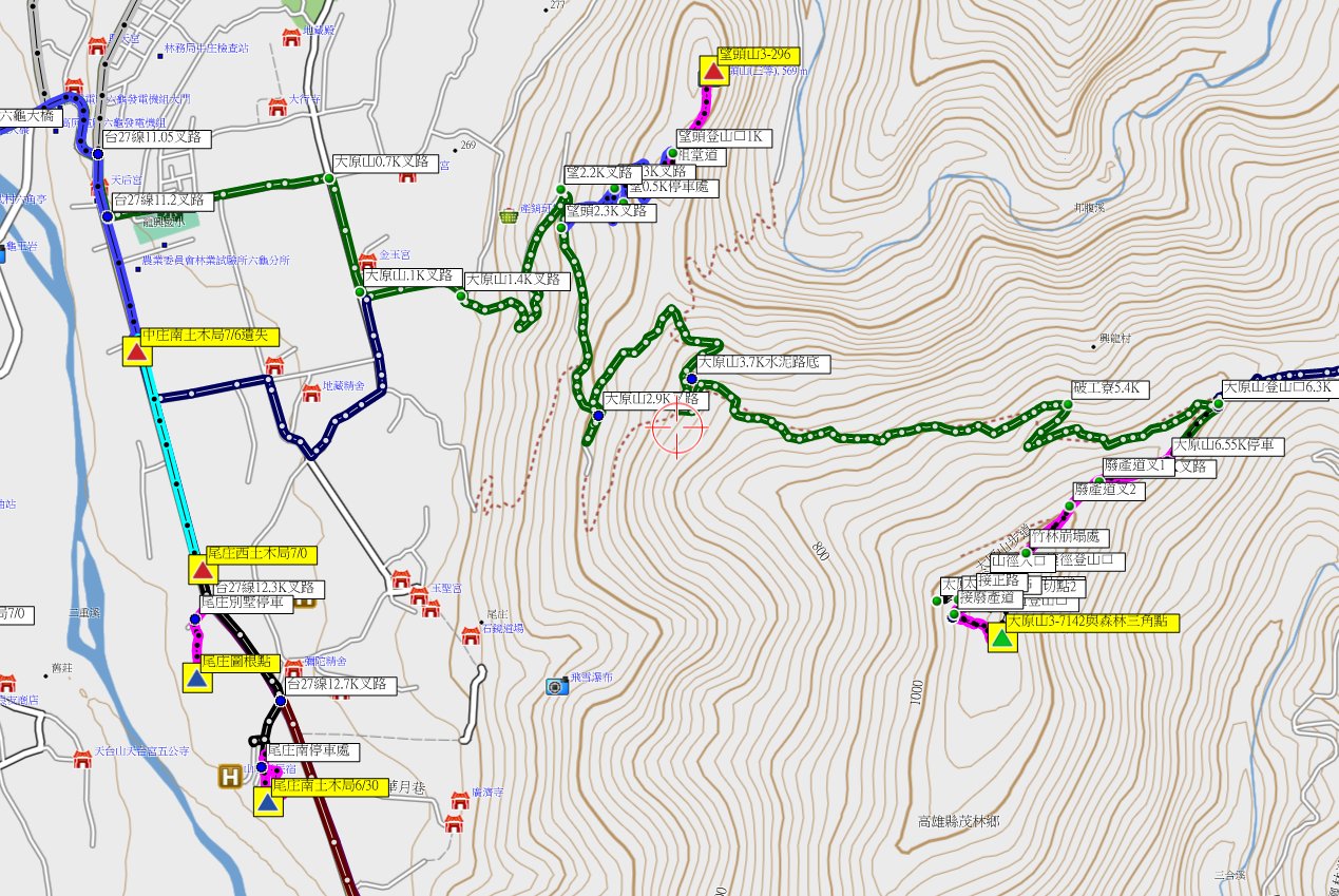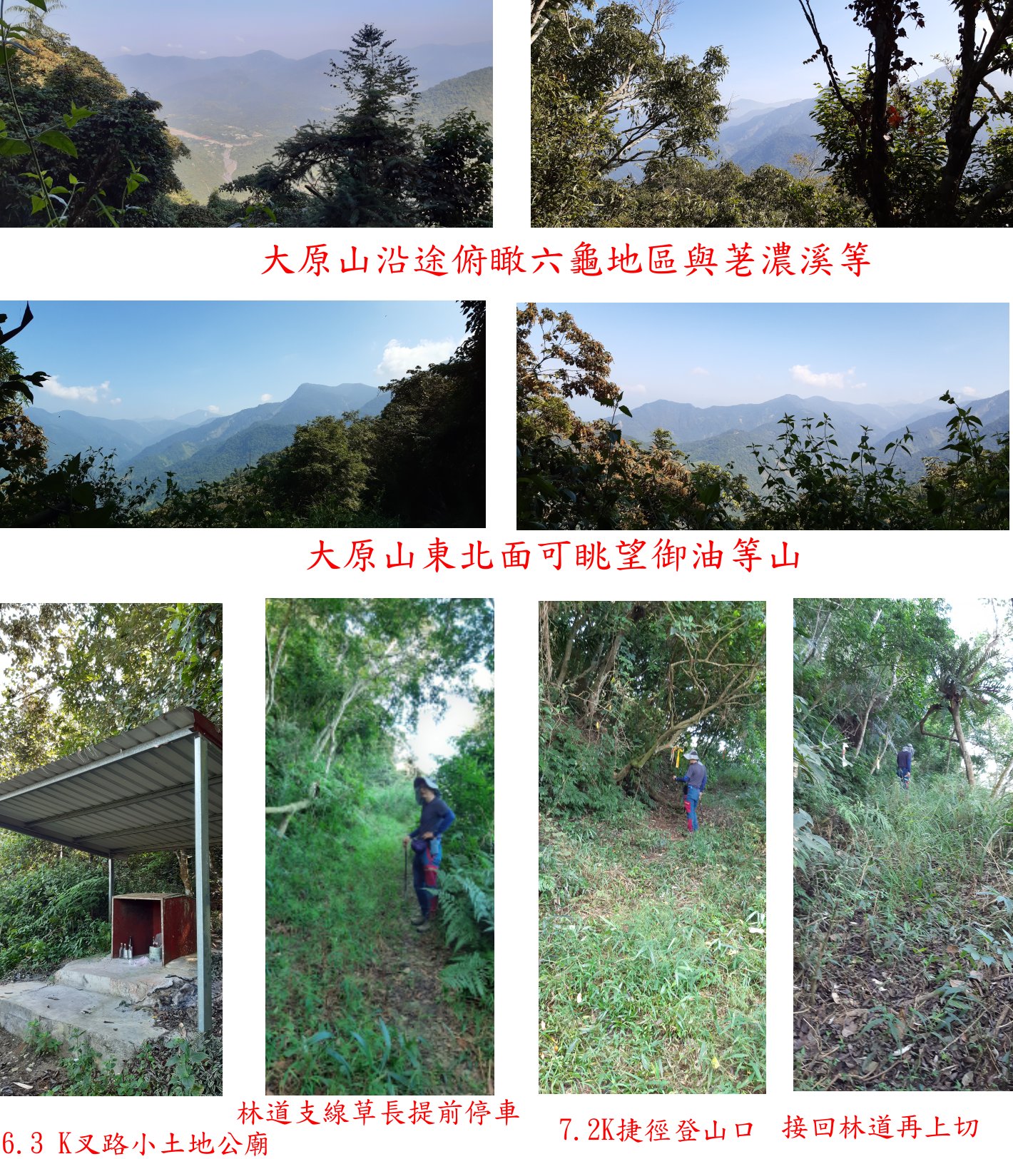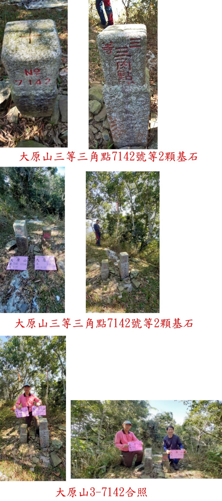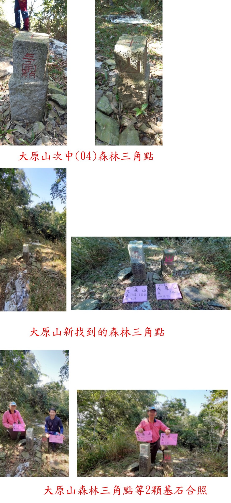 3、大原山:位在高雄市茂林、六龜、桃源三區交界處,標高1114公尺,三等三角點7142號與森林三角點;座標215446 2542644。