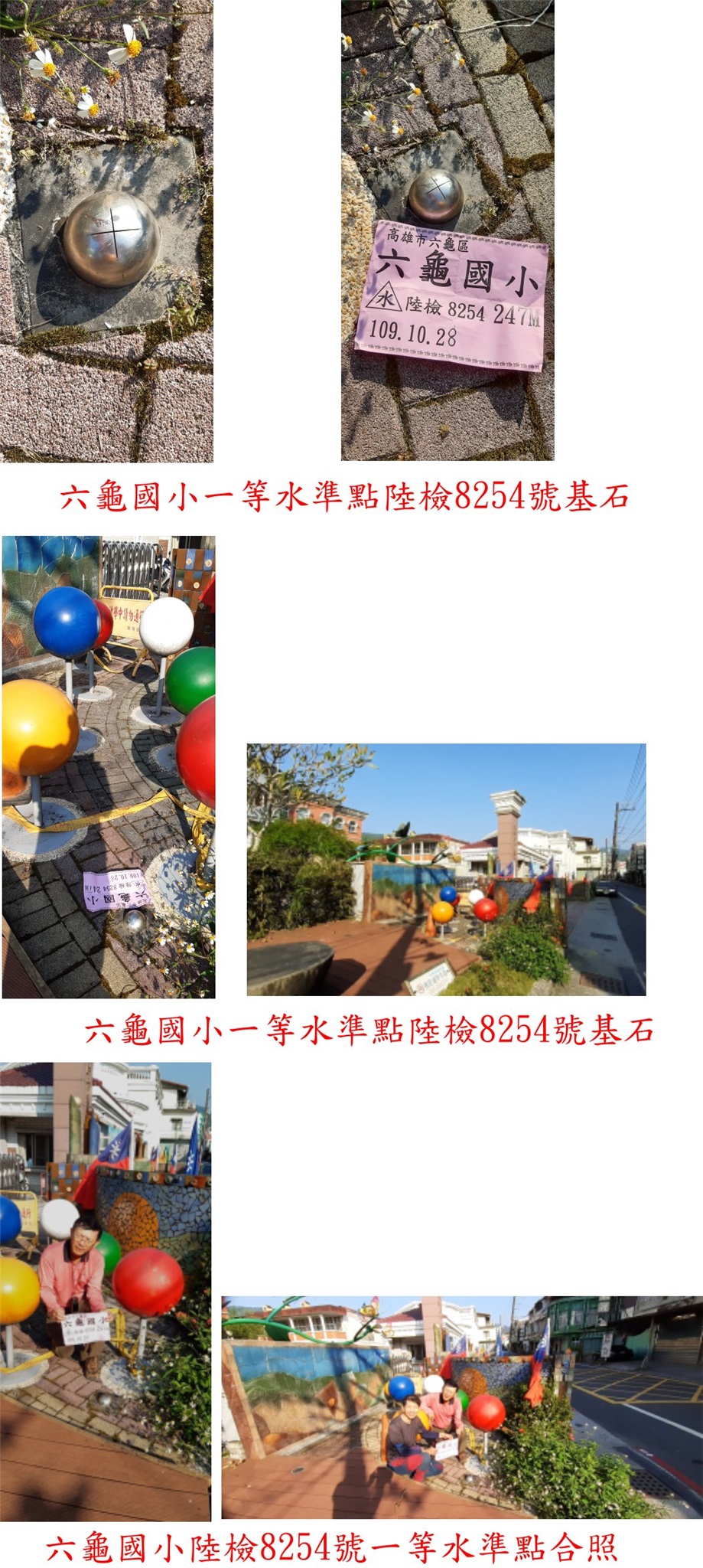 六龜國小陸檢8254號一等水準點就在校門口左側,於人行道只露出頂端的大鋼珠;此點幾個月前來過沒找到,校門應該有變更過以前在校門口右側,看不到以為遺失,山友說還在特別再來一次。