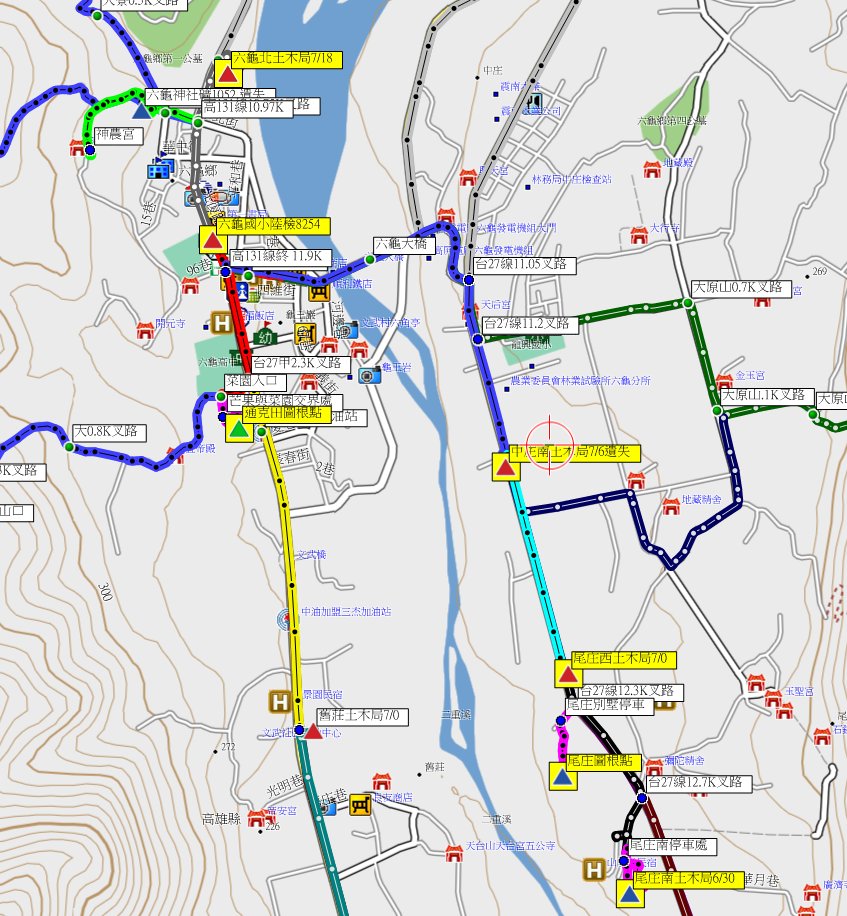 2、六龜國小:位於高雄市六龜區,標高247公尺,一等水準點陸檢8254號基石;座標211696 2544140。