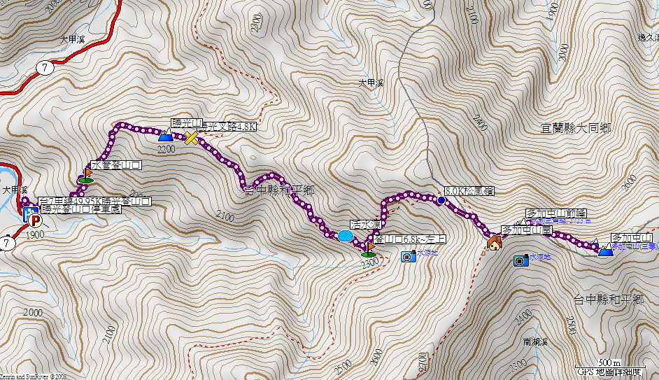 多加屯山:位於宜蘭縣大同鄉與台中市和平區交界處,隸屬於中央山脈,南湖大山往西延伸出來的支脈尾端,是登南湖大山的第一座山頭,而在其半山稜線起點的松風嶺則以大片二葉松純林聳立,地上滿是松針舖地,整個週遭環境盡是松香而聞名,海拔2794公尺,三等三角點No.6326。登山口在往北一段步道途中9.32K左入箭竹林約10秒即可見基點。2014/06-24
