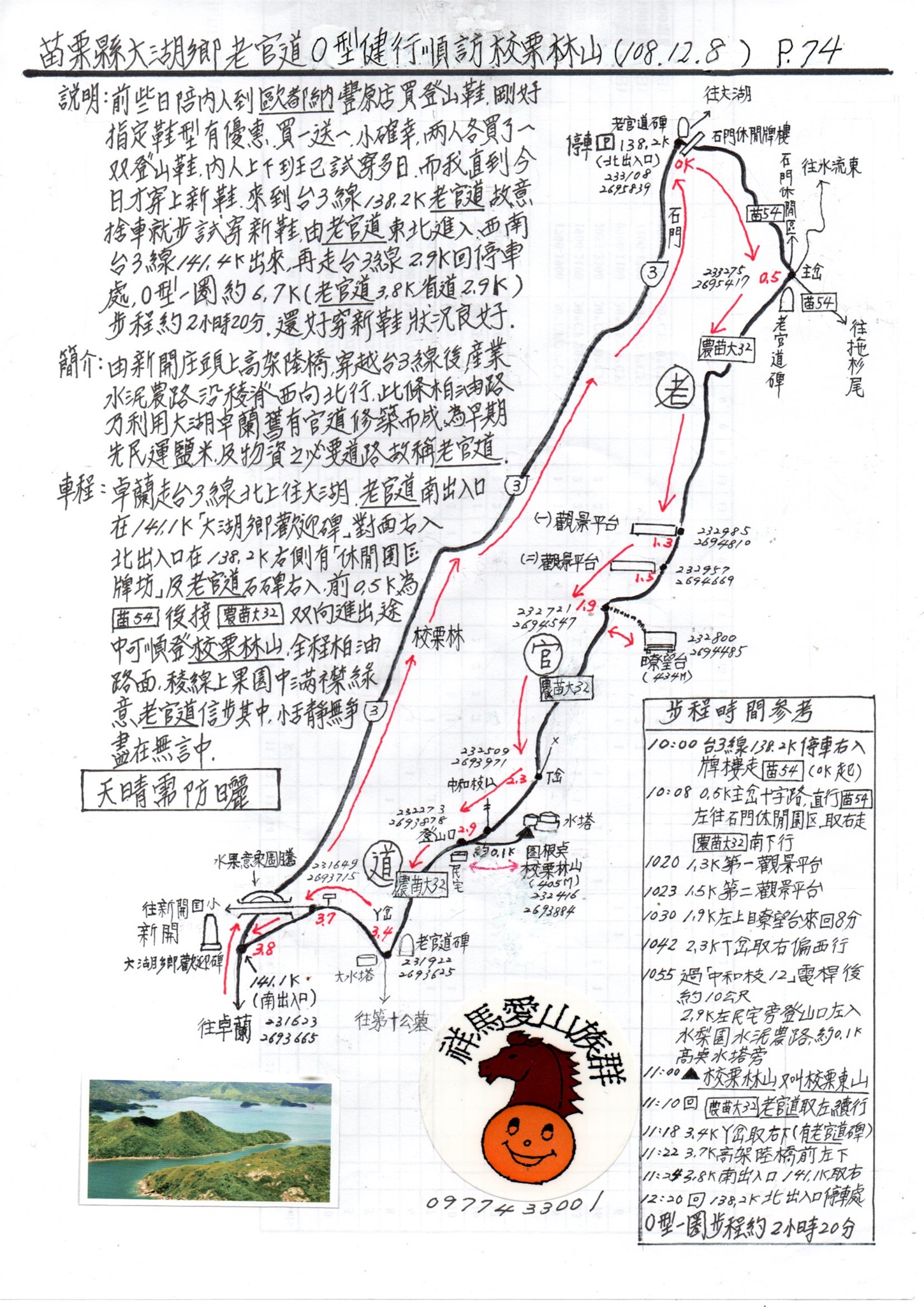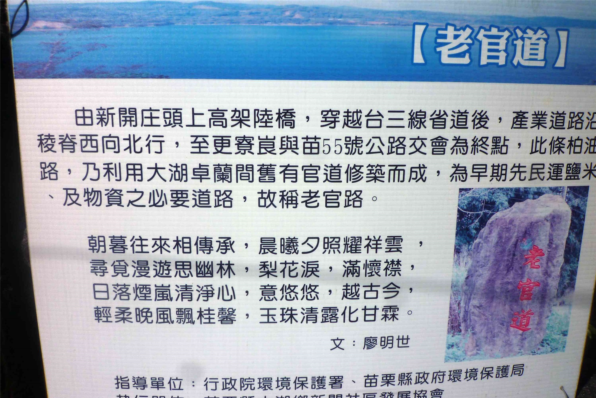 3卓蘭走台3線北上往大湖,老官道北出入口在里程138.2K,有「休閒園區牌樓」及老官道碑右入苗54鄉道(0K起)