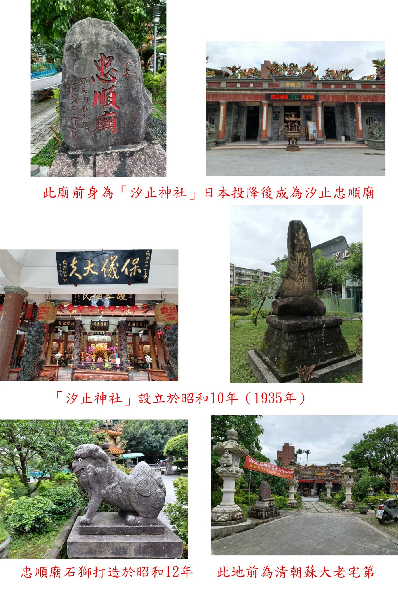 汐止忠順廟位置的前為清朝蘇大老宅第,大正11年(1922年)日本政府租下蘇宅正廳及其左右兩間房間,作為「能久親王遺跡所」,後於昭和10年(1935年)設立「汐止神社」,至1945年日本投降後成為汐止忠順廟,神社的鳥居係後來增建,此廟特色係有許多石燈籠,並由不同的人捐獻年代為昭和12年或14年。