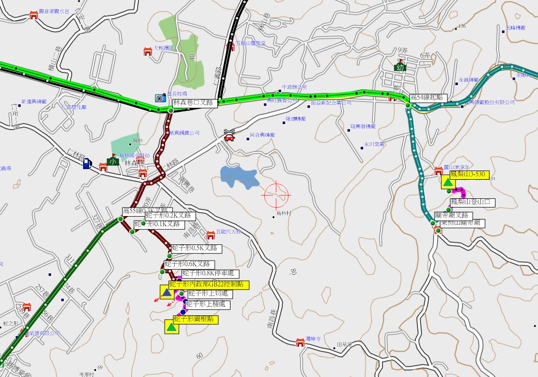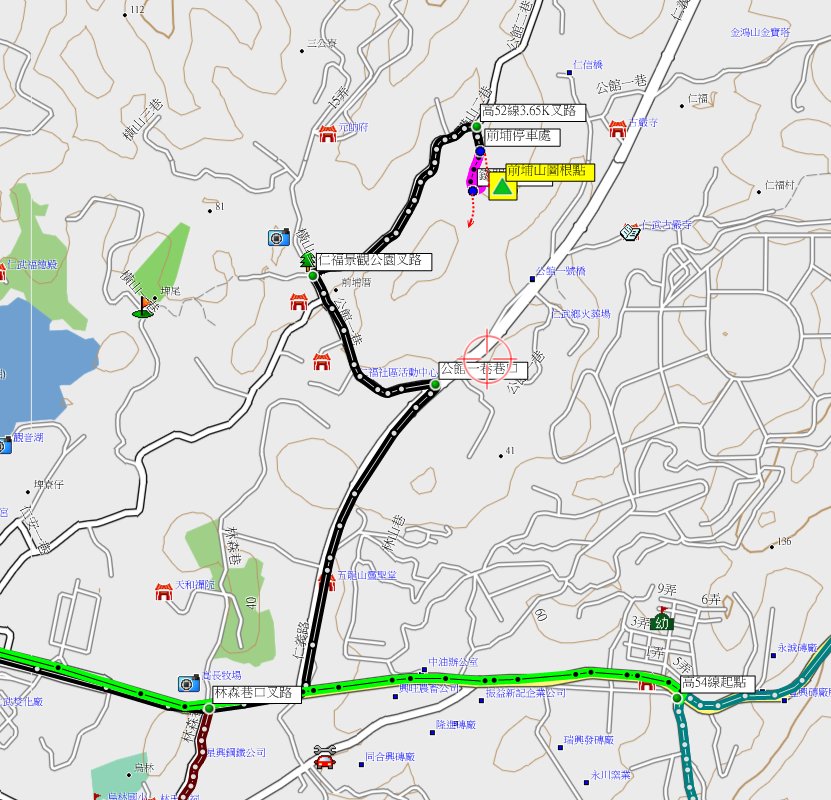 由前埔山原路回至水管路叉路,左轉水管路三段走0.3K,左轉林森巷走0.45K,右轉仁林路走140公尺,左轉仁心路走270公尺(高55線0.3K處)【0K】;左轉巷道走110公尺,左轉巷道續走110公尺(0.2K叉路),路口有「建平公司」指標,右轉小路走0.4K(0.6K叉路),直行往民宅不取,左轉破碎路面的小路續走170公尺至叉路停車(0.8K叉路),高37公尺;右上水泥路有未上鎖鐵門,此線可通往部GB22控制點稍後再去。