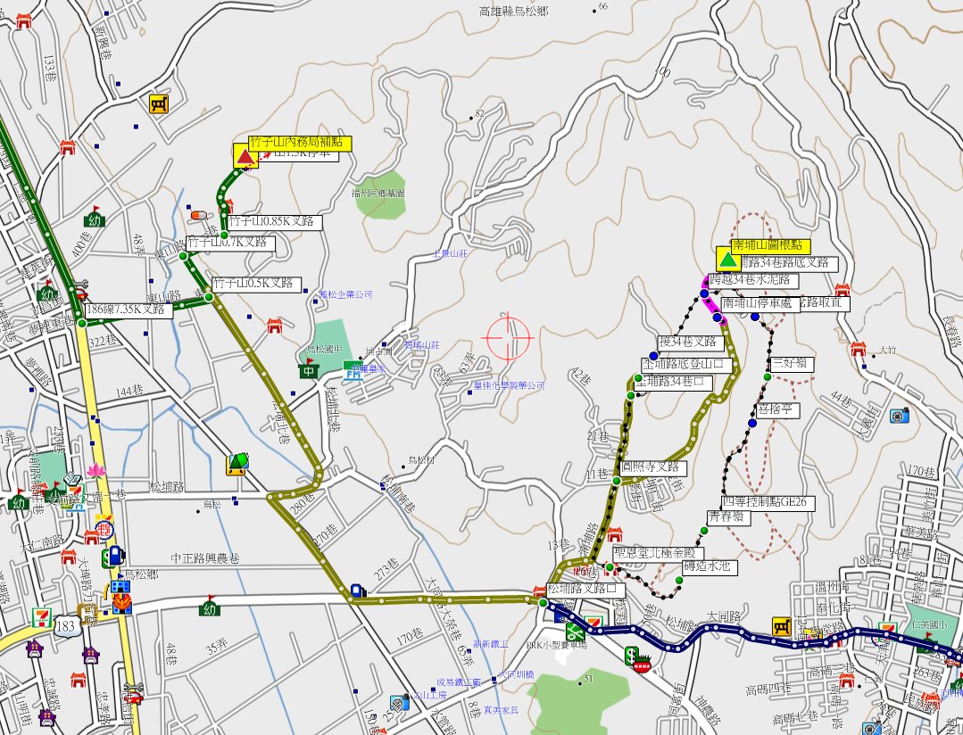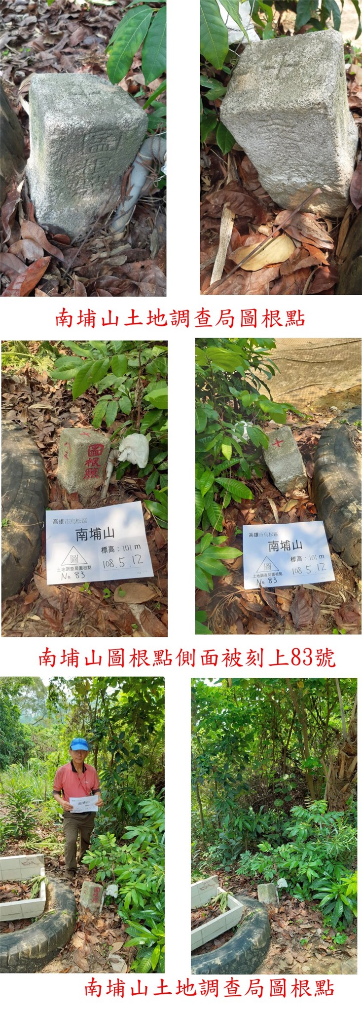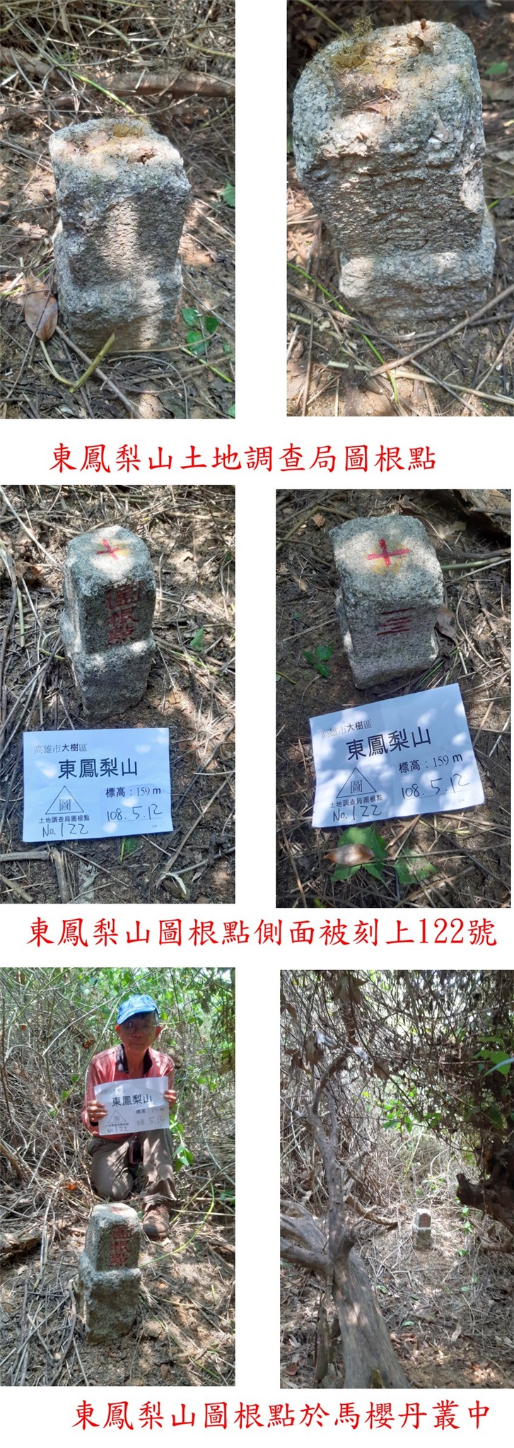 高雄基石之旅第二天(5/12)行程,第1座為前埔山圖根點,測量隊剛來過路況佳,拉繩陡上走10分鐘即登頂;第2座為蛇子山圖根點,距離短但蔓藤纏繞要砍路,走了21分鐘登頂,很難搞的小山,附近山頭另有顆內政部GB22四等控制點;第3座為竹子山內務局補助三角點,此點於路旁稜線上記錄只要1分鐘,但雜草叢生砍了40分鐘還是摃龜,緣分未到下回再戰;第4顆為南埔山圖根點,當地人運動熱門的郊山有多條路線可上山,步道走7分鐘即登頂,旁另有顆內政部CE17四等控制點,山頂有休憩棚視野不錯;第5顆的井子角圖根點,此點於路旁的荔枝園內,基石被樹枝蓋住若非地主指點不容易找到;第6顆為東鳳梨山圖根點,於果園內以前很好走,現果園荒廢稜線蔓藤纏繞,一路砍上去走了20分鐘才登頂,基石於蔓藤叢中找了一陣子方尋獲,出乎意料的難搞,下山後順道至莊家古厝参觀;早上走了6顆基石,有1顆沒找到,只要5顆基石入帳,幾乎每座山蚊子都超多,被叮的很慘。