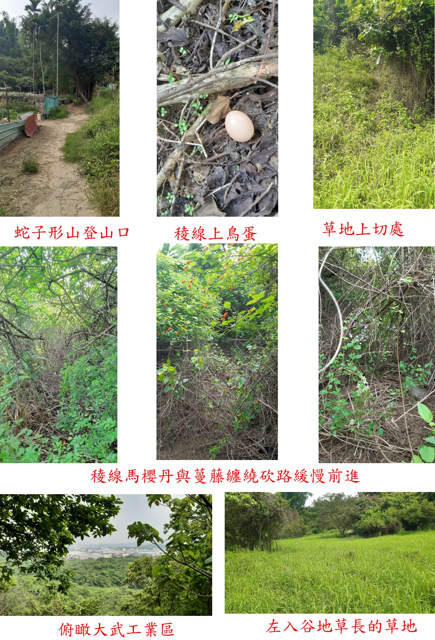 取左前開墾地小土路走約80公尺工寮,直行有明顯小徑,取左入谷地草長的草地走50公尺至山腳下;取右入山徑後段路徑消失要自行砍路,此段走約80公尺上至稜線,稜線馬櫻丹與蔓藤纏繞,取右砍路緩慢前行走約120公尺,山頂見到蛇子形山圖根點,側面被刻上107號;基石於蔓藤叢中有砍出一小空地,山頂於林內無展望,稜線上可俯瞰大武工業區,上山走21分鐘,山頂蚊子超多,此山往返費時44分鐘,屬很難纏的小山。