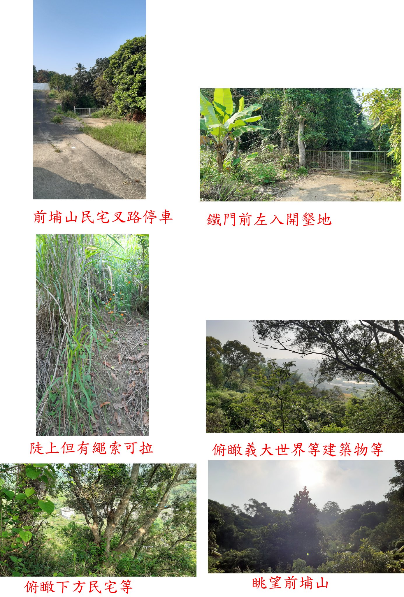 取右繞過鐵門水泥路走120公尺有另一鐵門,於鐵門前左入開墾地隨即上切抵達稜線,左下方即無人居住民宅;取右順稜行,測量隊來過不久路況頗佳,隨即轉為急陡上但有繩索可拉,上至山頂隨即見到前埔山圖根點,側面被刻上84號;有測量隊的告石牌,基石旁有纜線的絞盤,山頂展望欠佳,樹梢間可俯瞰義大世界等建築物等,上山走10分鐘,此山往返費時28分鐘、屬簡單的小山。