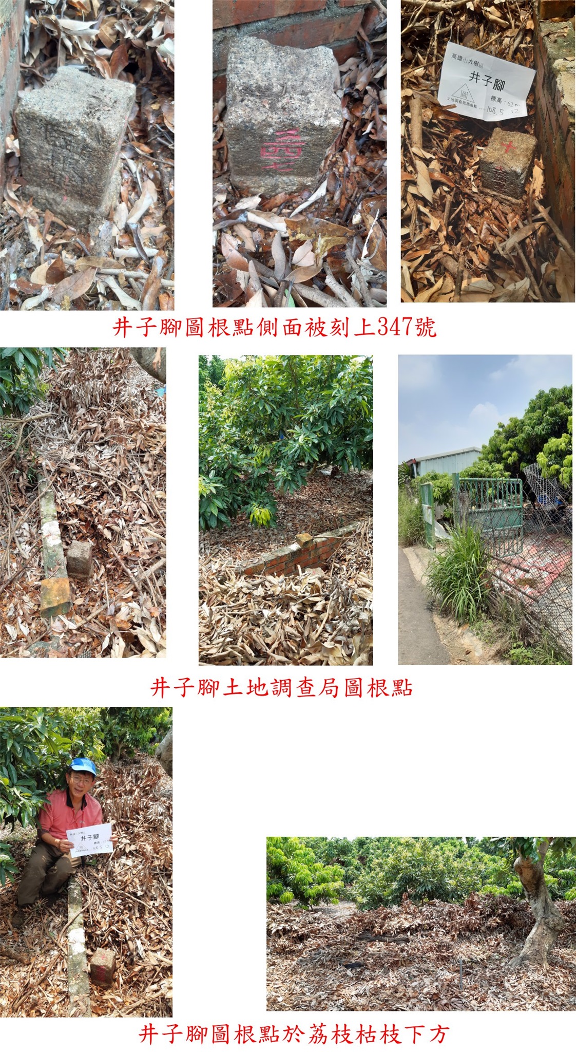 左入有鐵門的荔枝園,地主剛好在熱心帶領果園走約60公尺,於二塊田地交界的紅磚矮橋邊見到井子腳圖根點,側面被刻上347號;此點果園地主刻意以荔枝的枯枝掩蓋以保護基石,如沒地主指點恐怕要花點時間尋找,地主於矮磚牆上有擺一塊紅磚當記號,將荔枝枯枝移開即可找到。