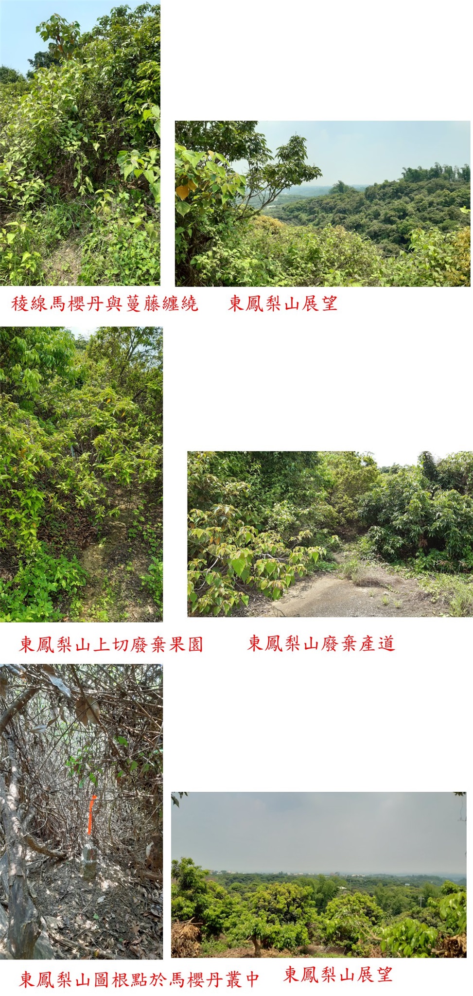 荒廢的果園農路走35公尺叉路,取右廢棄水泥路續走45公尺,果園農路已荒廢難行;取左進入廢棄已久的芒果園跟隨水管往上,馬櫻丹密布不砍很難通行,水管路走約30公尺;取右進入疏林走40餘公尺,於稜線下再度遇到馬櫻丹叢,砍路上至稜線的廢棄果園、馬櫻丹與蔓藤纏繞,此處視野頗佳,取右砍路緩慢前行走60餘公尺至山頂,來回找了許久方於馬櫻丹叢中見到東鳳梨山圖根點,側面被刻上122號;基石很隱密於稍低處的馬櫻丹叢中,山頂無展望舊時為果園,本想很簡單的小山卻踢到鐵板搞得筋疲力盡,且被蚊子叮得很慘,祥馬的北稜線應較好走;上山走20分鐘,此山往返費時48分鐘。