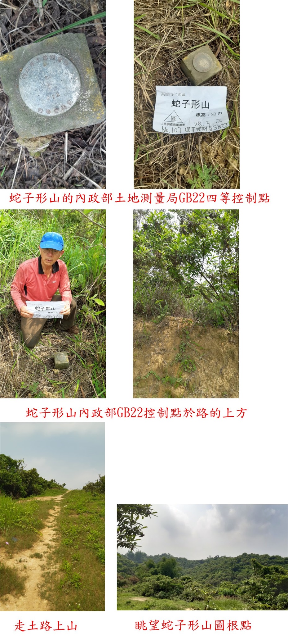 ◎回至蛇子形山叉路停車處,取右水泥路進入未上鎖鐵門、隨即轉為土路,走135公尺至開墾地高點,找了一下子方尋獲蛇子形山的內政部土地測量局GB22四等控制點;銅標基石於右上方高點的稍低處的草叢中要仔細找,資料上為S822應為錯誤,上來只要3分鐘,此點往返費時15分鐘。