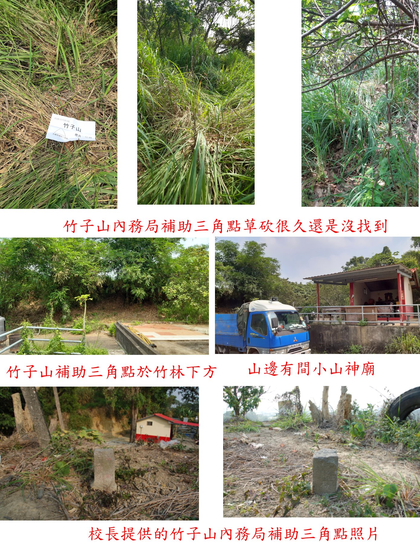 左上走約5公尺上去稜線,上切處有一水泥柱,倒竹與長叢不知如何找起?依山友紀錄上來只要1分鐘,基石於瘦稜上不在高點,將瘦稜的長草又砍又綵幾乎踩平了基石杳無蹤跡,高點有碉堡與廢棄建築亦找不到,搞的筋疲力盡費時40分鐘竹子山內務局補助三角點還是摃龜,又被蚊子叮得滿頭包,緣分未到下回再戰;後來跟校長要到基石照片,此點就在上切處水泥柱的附近,靠近竹林的高點,砍錯地方有點遺憾。